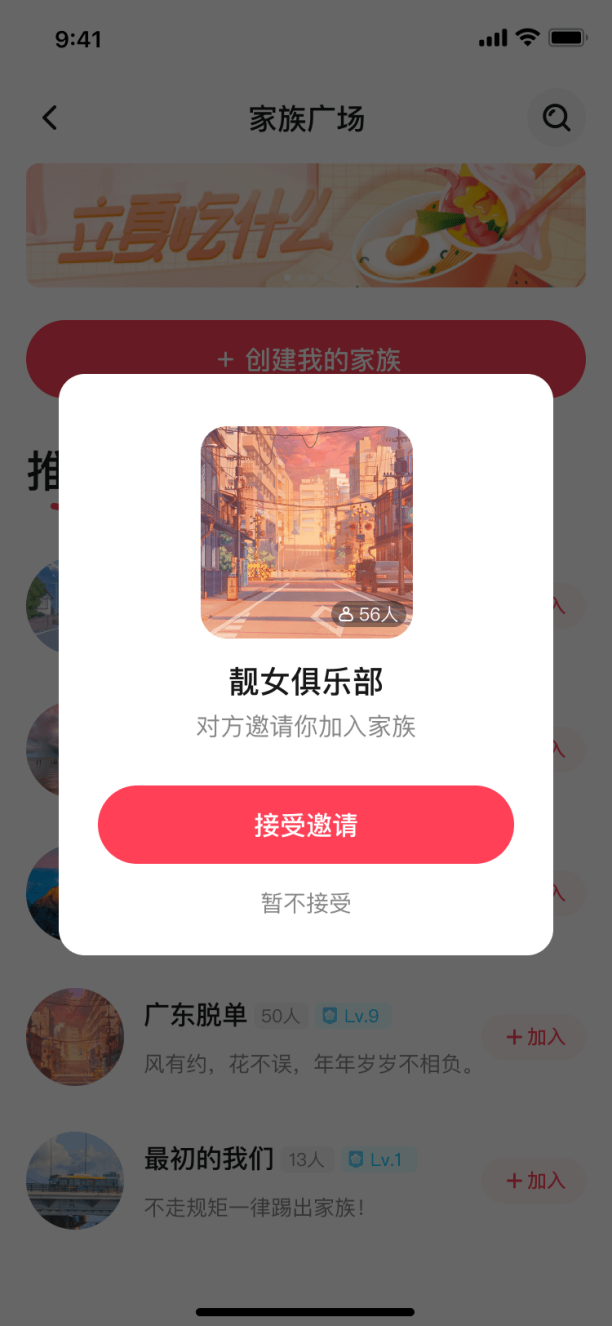 据了解,“家族”为多人交友群的代称,用户可以选择一个感兴趣的多人群聊加入,与“家族”内的其他用户分享自己的生活乐趣,结识更多志趣相投的朋友;也可以与好友共同创建“家族”,组建自己的专属线上社交圈,与全国单身用户相遇、畅聊。