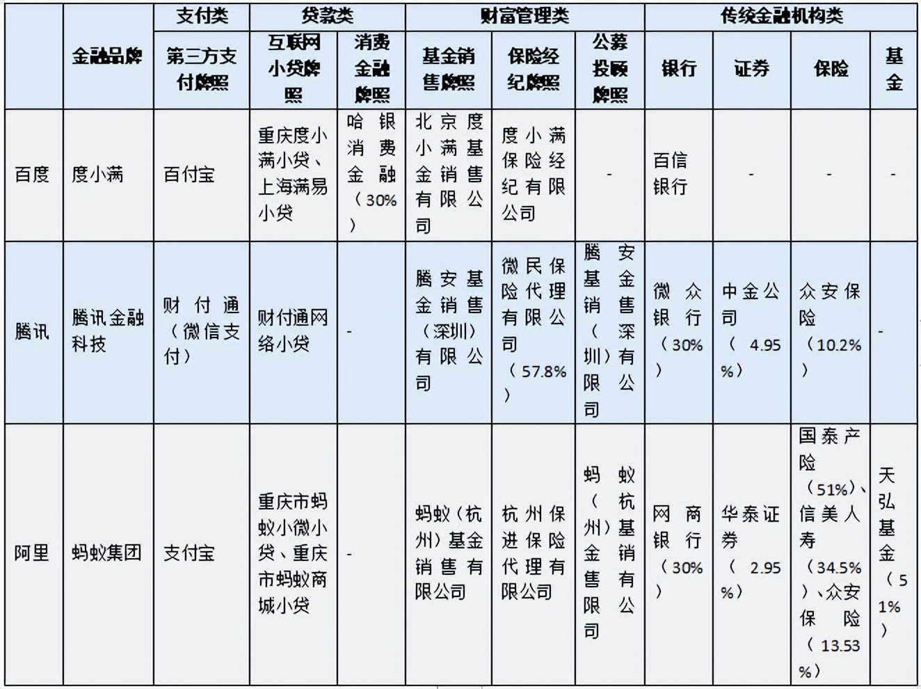 首先,数据猿整理了三家机构在金融领域的牌照布局对比。详见下表。