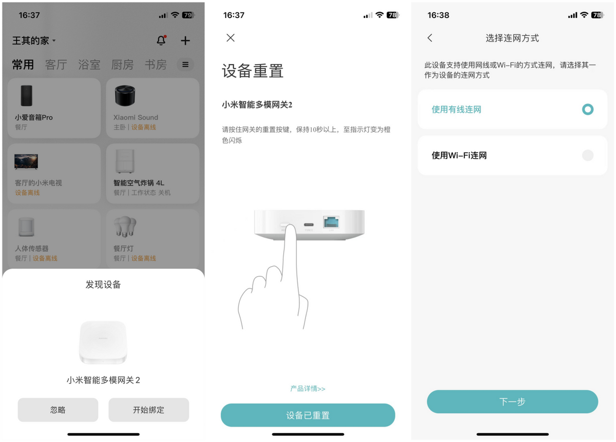 首次通电使用,打开米家App会自动弹出小米智能多模网关2设备,简单选择联网方式进行绑定使用。后续可以长按网关的重置按键进行设备重置。