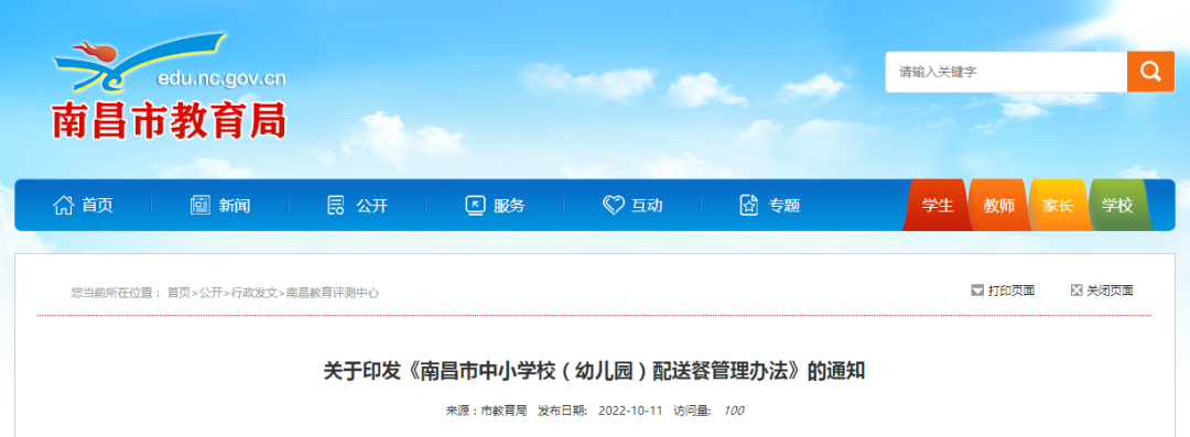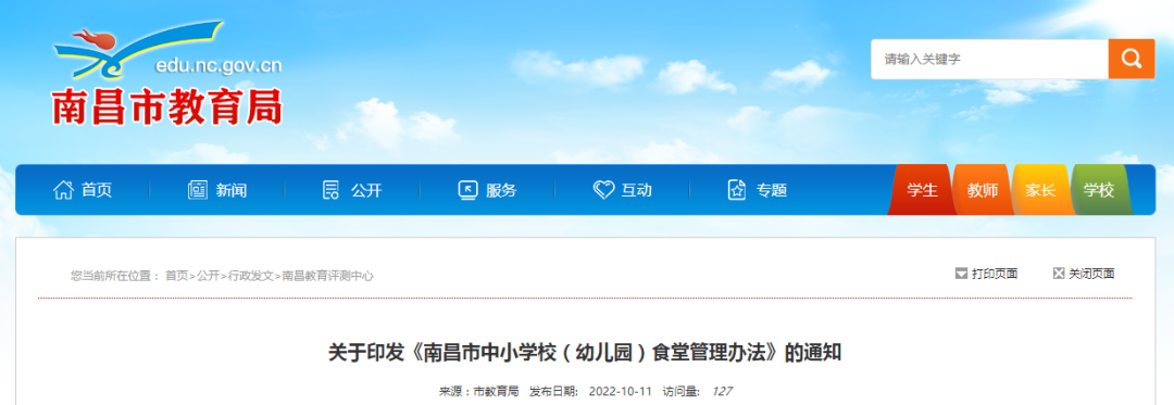 10月11日,南昌市教育局发布关于印发《南昌市中小学校(幼儿园)食堂管理办法》的通知、关于印发《南昌市中小学校(幼儿园)配送餐管理办法》的通知。
