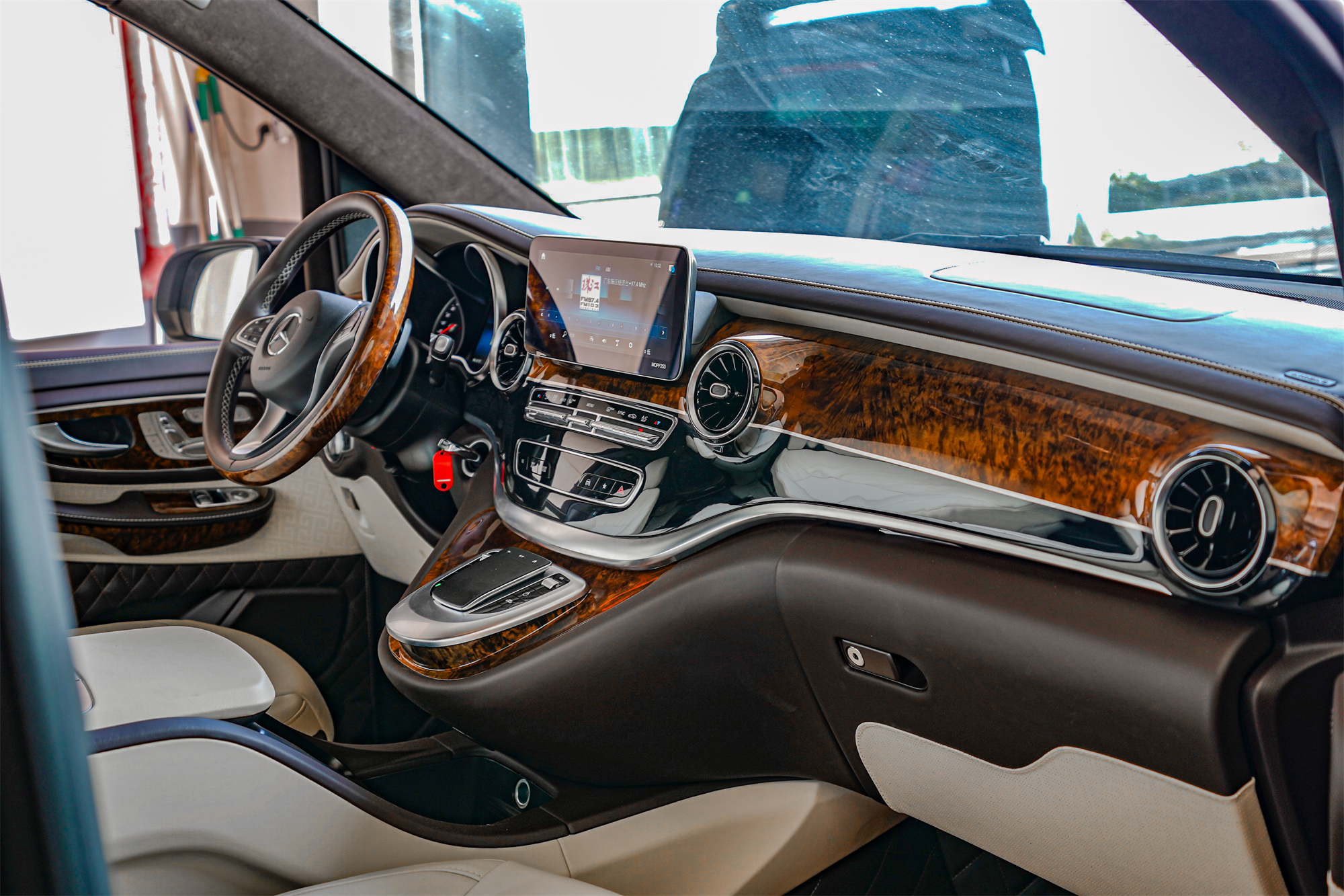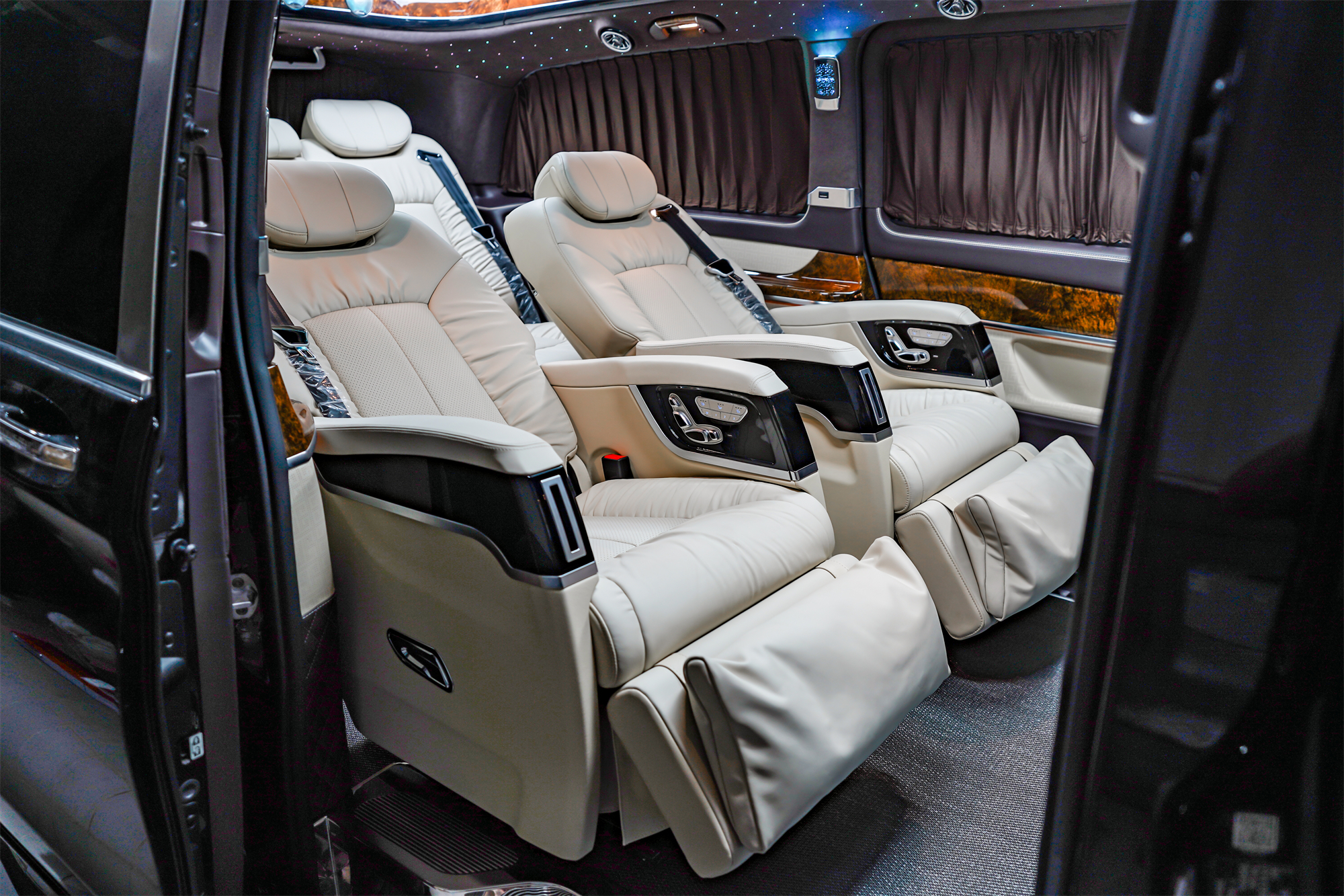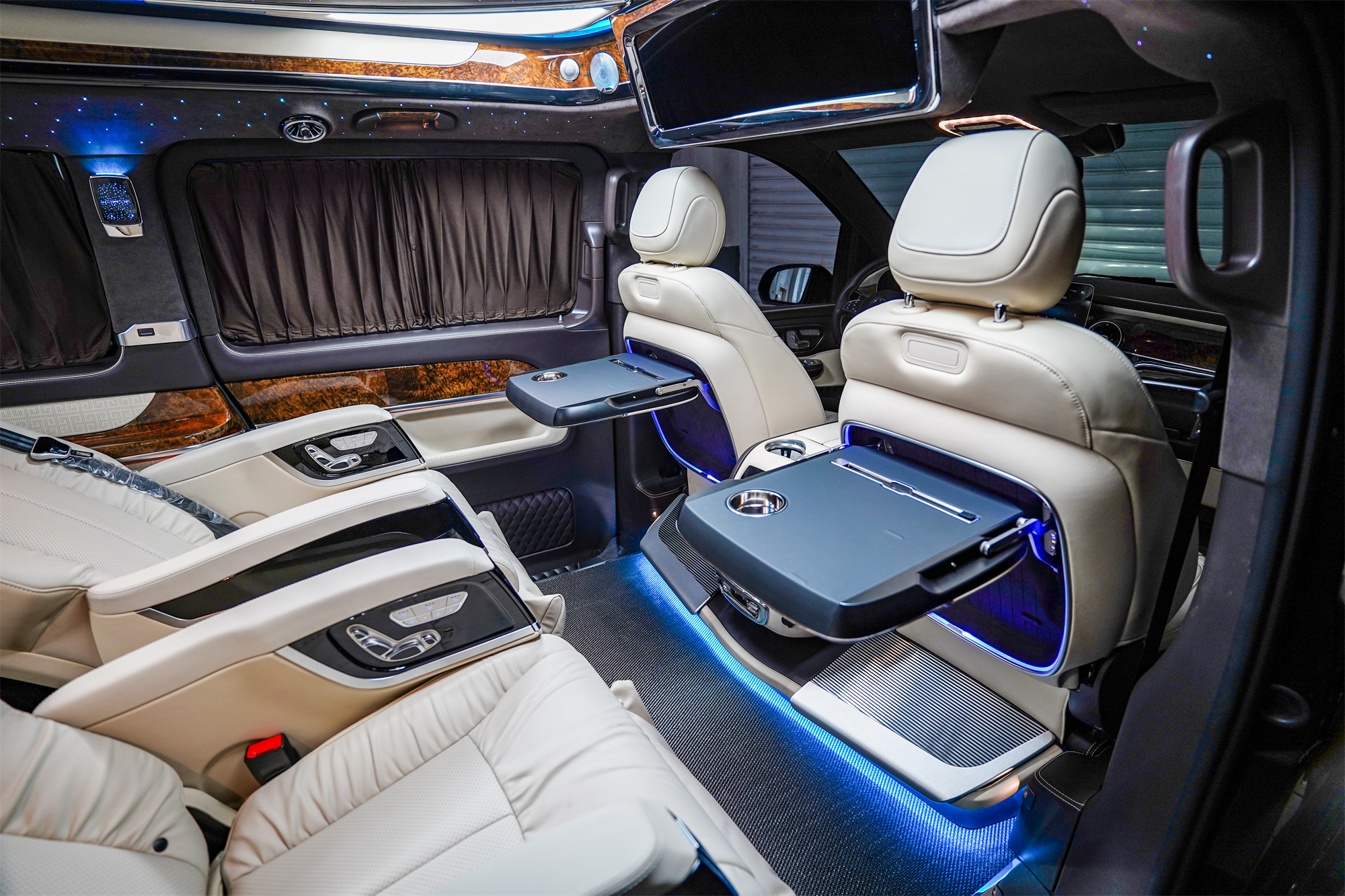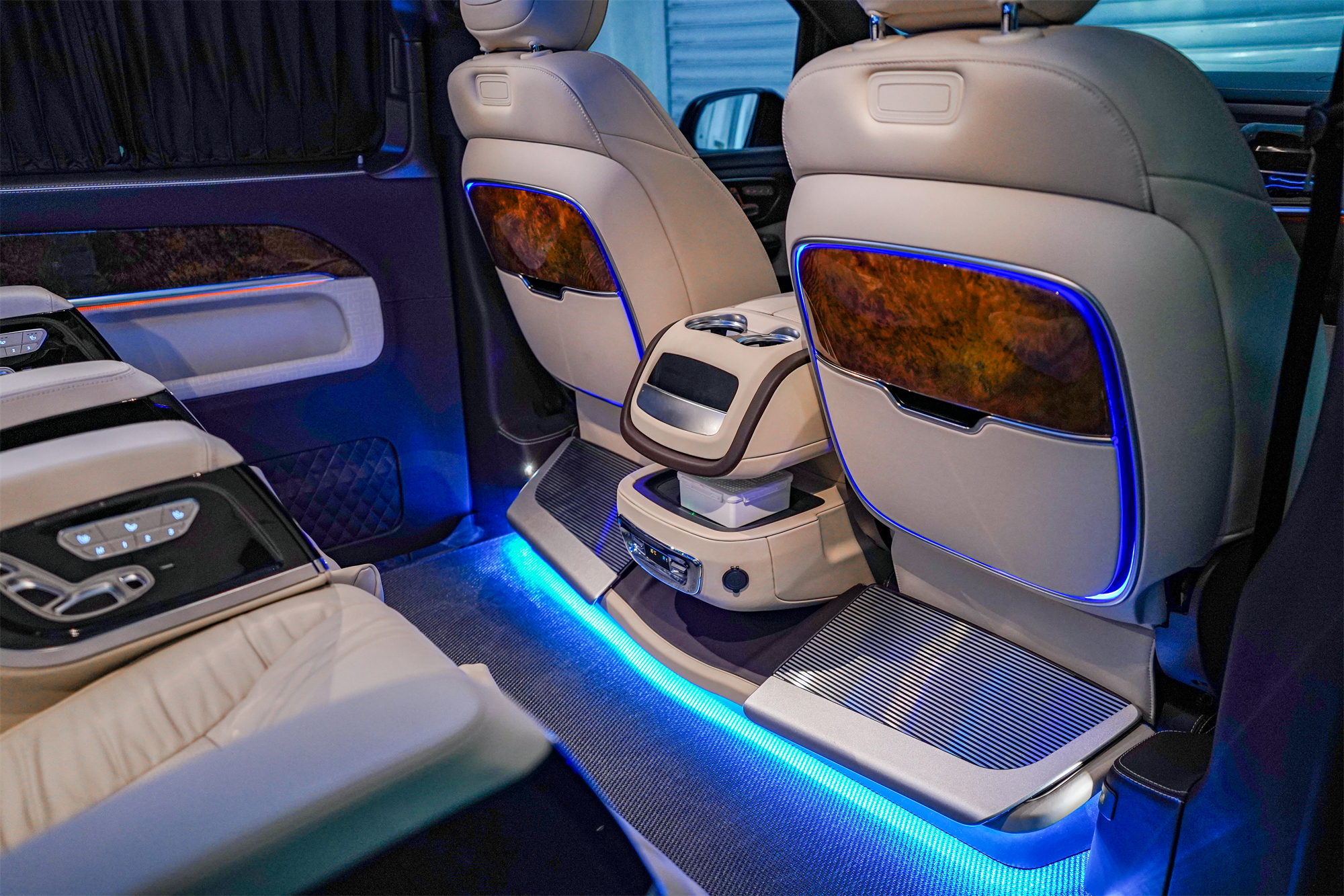 米白色搭配深棕色,麂皮绒+真皮的结合,巴赫三连钟表,再加上环保艺术编织地毯,非常尊贵。中排是独立两座的头等舱座椅,具备通风、加热、按摩、旋转对坐、电动腿拖等功能,随时调整到最适合自己的状态。
