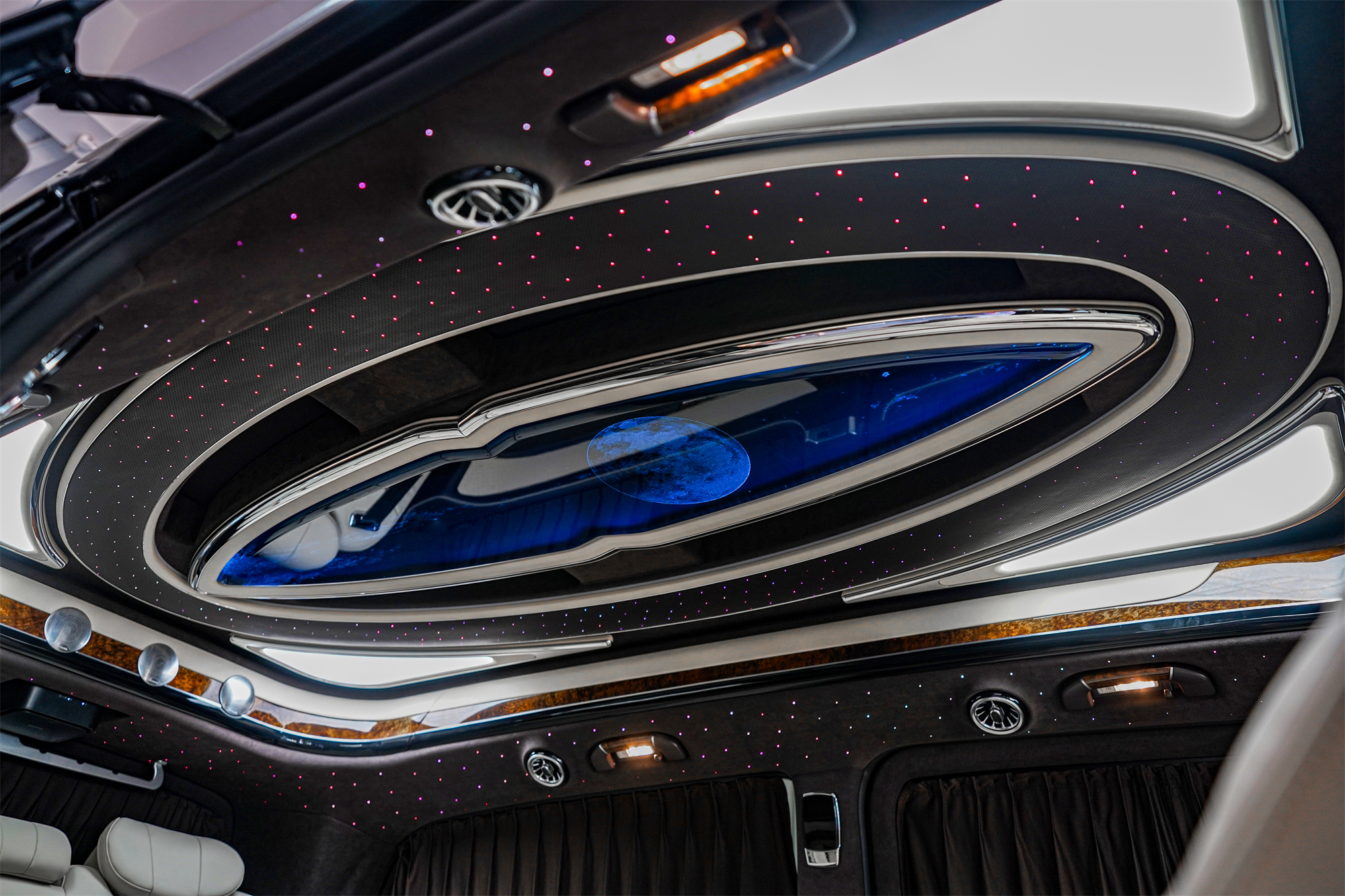 内饰方面的升级才是真奢华。打开车门,最抢眼的便是内舱顶部的灯饰,宇宙飞船顶灯、环形影院式星空顶,以及流水氛围灯,64种颜色可变,整体的视觉效果超棒的。处在这“浩瀚星海”中,所有的压力焦虑烦恼,全都烟消云散了。