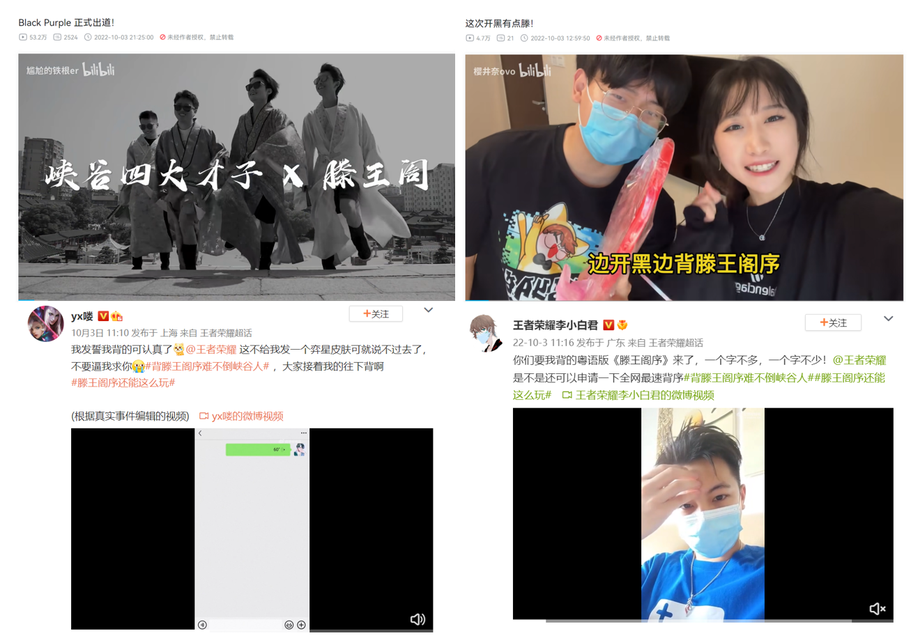 为了号召大众一起参与文化共创,共同传承、弘扬中国传统文化,《王者荣耀》携手滕王阁景区,基于滕王阁长期开展的背《滕王阁序》免门票活动,还共同发起了“花式背《滕王阁序》”的文化共创活动,大众不仅可以在滕王阁线下背序赢取免费门票,还可在线上参与花式创意背序挑战,获取免费弈星·滕王阁序皮肤,花式背序的形式包括但不限于双语、rap、唱歌等。活动发起后,在微博、B站、抖音和快手平台#滕王阁序还能怎么玩#的话题下,玩家们各显神通,以丰富又有意义的方式参与活动,纷纷发布了自己别出心裁的背序视频。