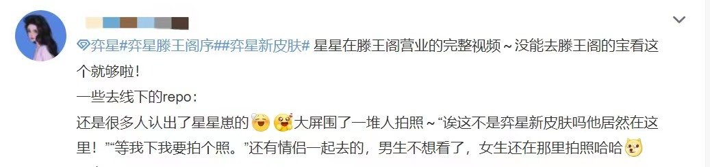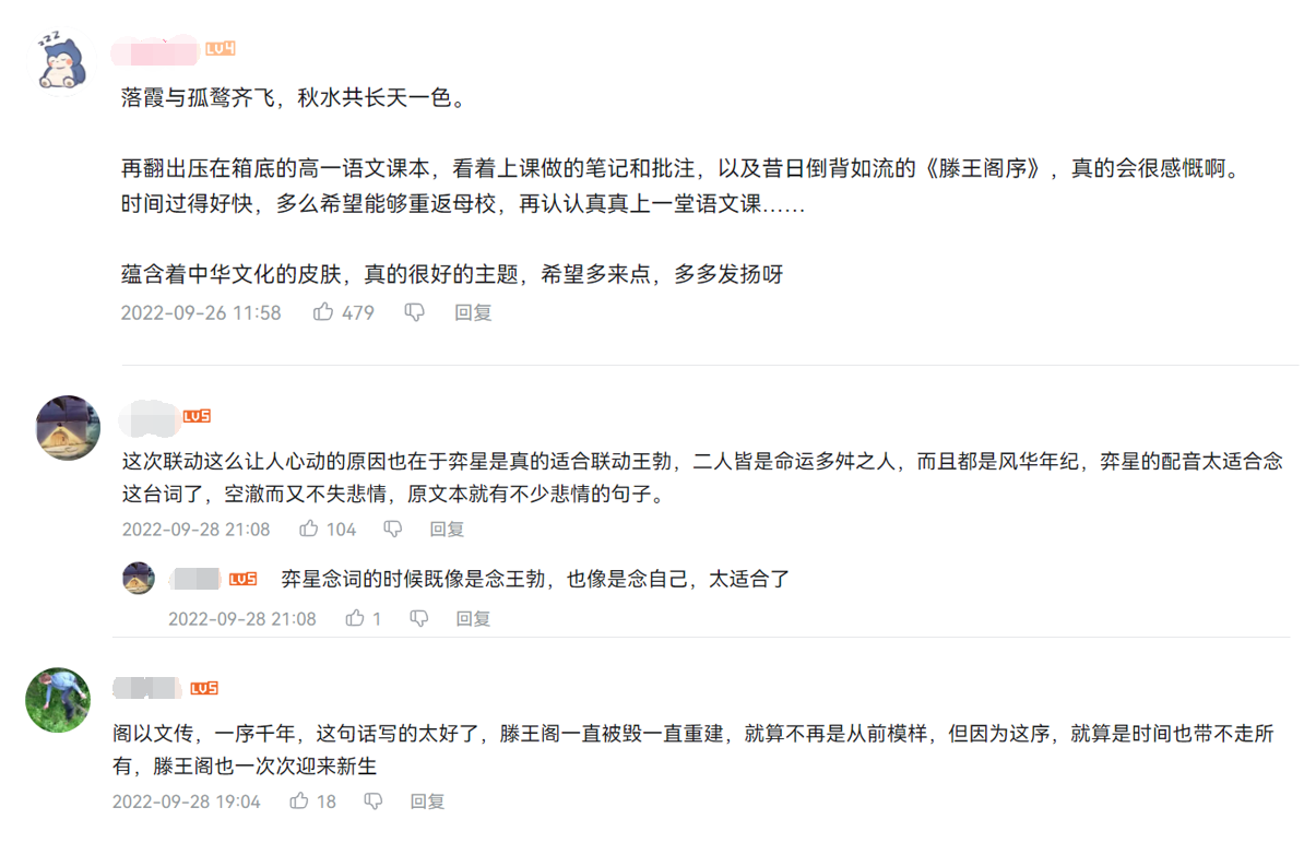 除此之外,《王者荣耀》开发团队以《滕王阁序》流传千年的风景、辞藻、文化、志向之美为切入点,依托数字化演绎方式诠释《滕王阁序》,在游戏中同步推出弈星·滕王阁序主题皮肤,同时还邀请到知名歌手林志炫演唱皮肤同名推广曲《滕王阁序》。