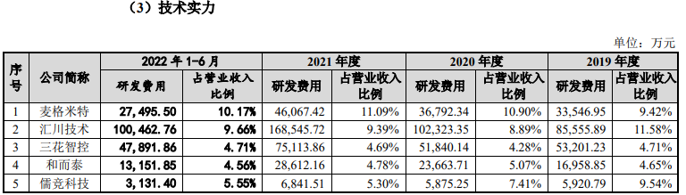 作为拟在创业板上市的企业,儒竞科技的科研成色表现也不足。2019年及2022年1-6月报告期各期,公司研发费用分别为5920.79 万元、5875.25万元、6841.51万元及3131.40万元,占当期营业收入的9.54%、7.41%、5.30%及5.55%。