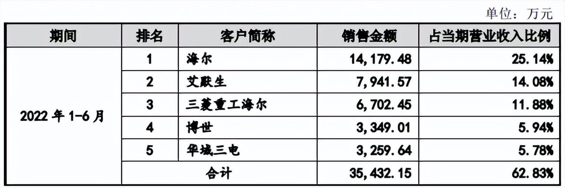 海尔则为公司的重要客户。公司对海尔的销售金额分别为1.78亿元、2.76亿元、4.05亿元及1.42亿元,占当期营业收入的比例分别为28.59%、34.83%、31.38%及25.14%。