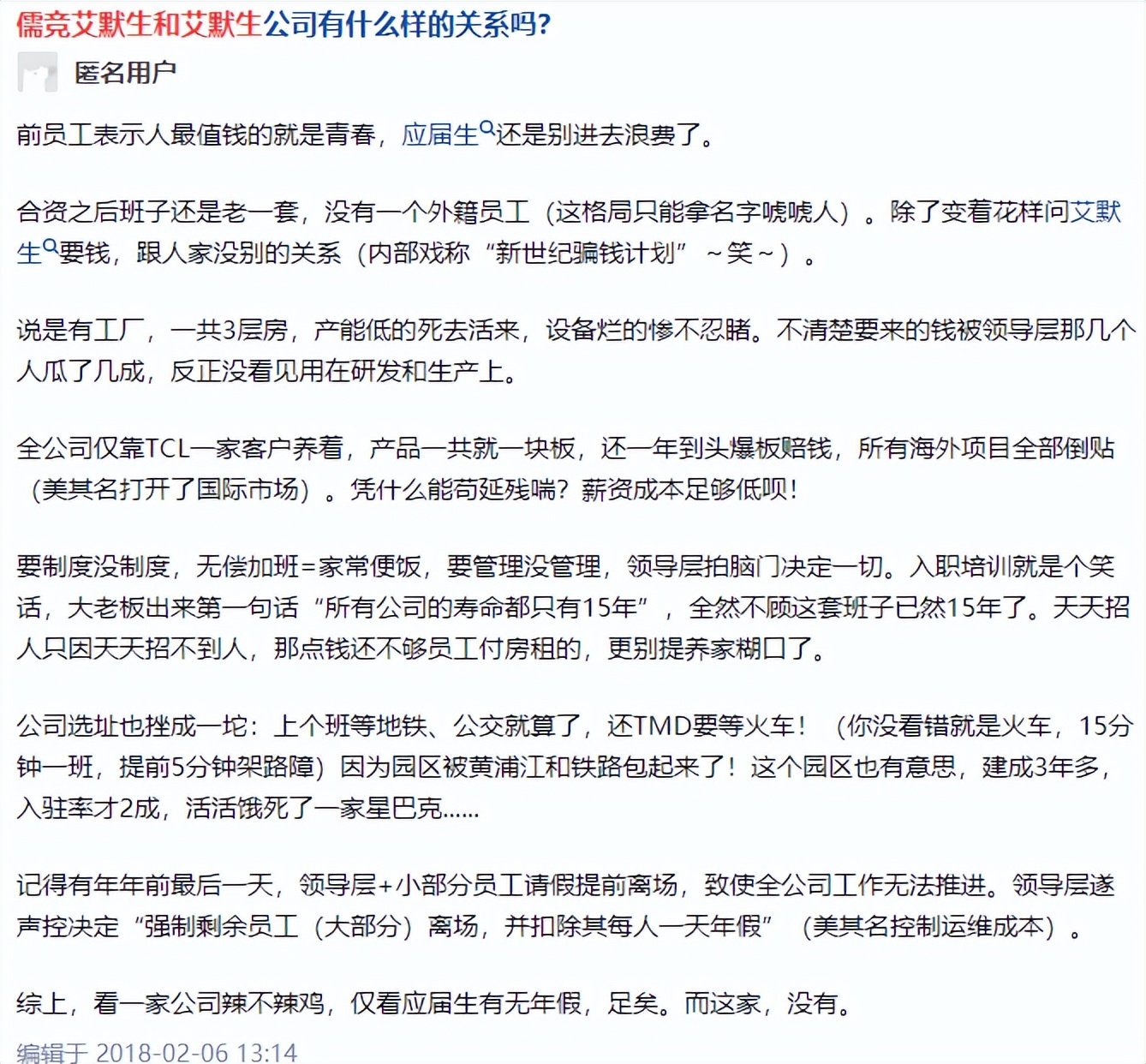 知乎上,儒竞艾默生此前的网评已让人大跌眼镜。有网友表示,合资之后班子还是老一套,没有一个外籍员工,这格局只能拿名字唬唬人。除了变着花样问艾默生要钱,跟人家没别的关系,内部戏称“新世纪骗钱计划”。