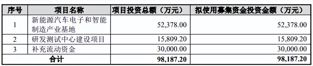 招股书显示,儒竞科技本次募集资金计划及投资项目主要为新能源汽车电子和智能制造产业基地、研发测试中心建设项目及补充流动资金,上述项目预计投资总额为9.82亿元。