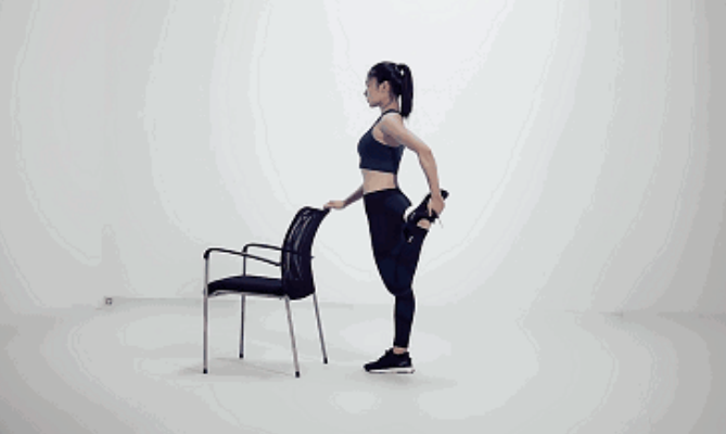 动作要点:躯干站直,腰部保持中立位,用手托起脚背屈膝,膝盖垂直向下,禁止塌腰、翘屁股。可感大腿前侧强烈拉伸感,静止拉伸持续30秒,可反复3次。