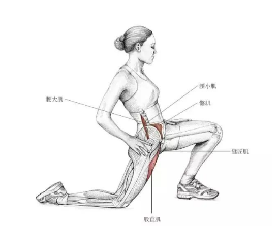 动作要点:摆出上图中的体位,双手叉腰,臀部保持中立位的同时向前推动,感到后侧大腿前部和腹股沟处有牵拉感。维持30秒,反复3-5次。