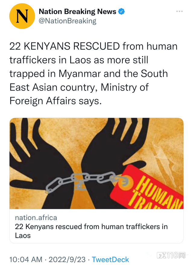 据肯尼亚主流媒体报道,肯尼亚政府警告肯尼亚民众:目前已有数百名东非民众成为人口贩运的受害者,被困在了东南亚,肯尼亚民众请不要相信“东南亚工作岗位网络高薪诚聘”。