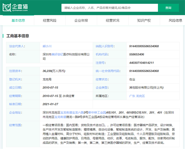 据企查猫显示,深圳市美好创亿医疗科技股份有限公司成立于2010年07月15日,注册地位于深圳市龙岗区宝龙街道宝龙六路3号新中桥工业园A栋101、201、601B栋C栋101、201、401(在深圳市龙岗区宝龙街道锦龙一路9号多利工业园A栋设有经营场所从事生产经营活动),法定代表人为熊小川。经营范围包括一般经营项目是:国内贸易;货物及技术进出口。,许可经营项目是:医疗器械产品研发、设计转换、生产技术开发及智能制造服务;精密模具、自动化设备、智能制造系统的设计、开发、生产及销售;医用植入金属材料、高分子材料、硅胶材料的制造;工业塑胶及硅胶制品、个人日用塑胶及硅胶制品、劳动防护用品、健康防护用品、日用品、母婴用品、纺织、皮革、毛皮制品、服饰、配饰、非家用纺织制成品的研发、生产及销售;第一类、第二类、第三类医疗器械的研发、生产、经营及技术咨询。深圳市美好创亿医疗科技股份有限公司对外投资4家公司,具有14处分支机构。