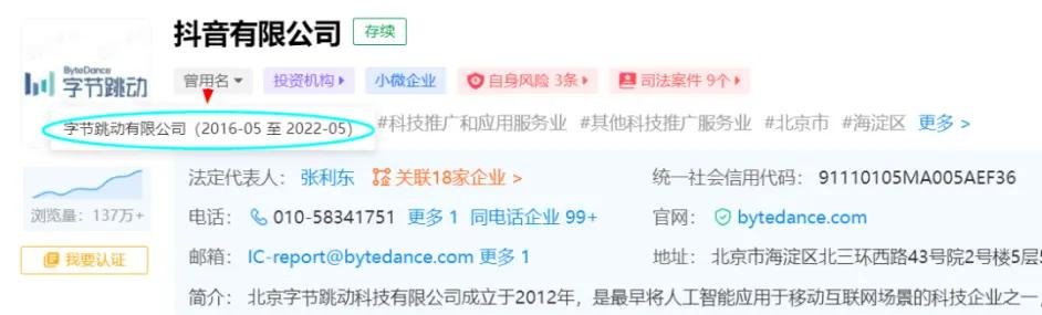 在今年五月份,字节跳动(香港)有限公司就把名字改为抖音集团(香港)有限公司。