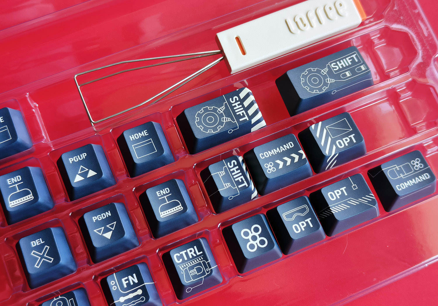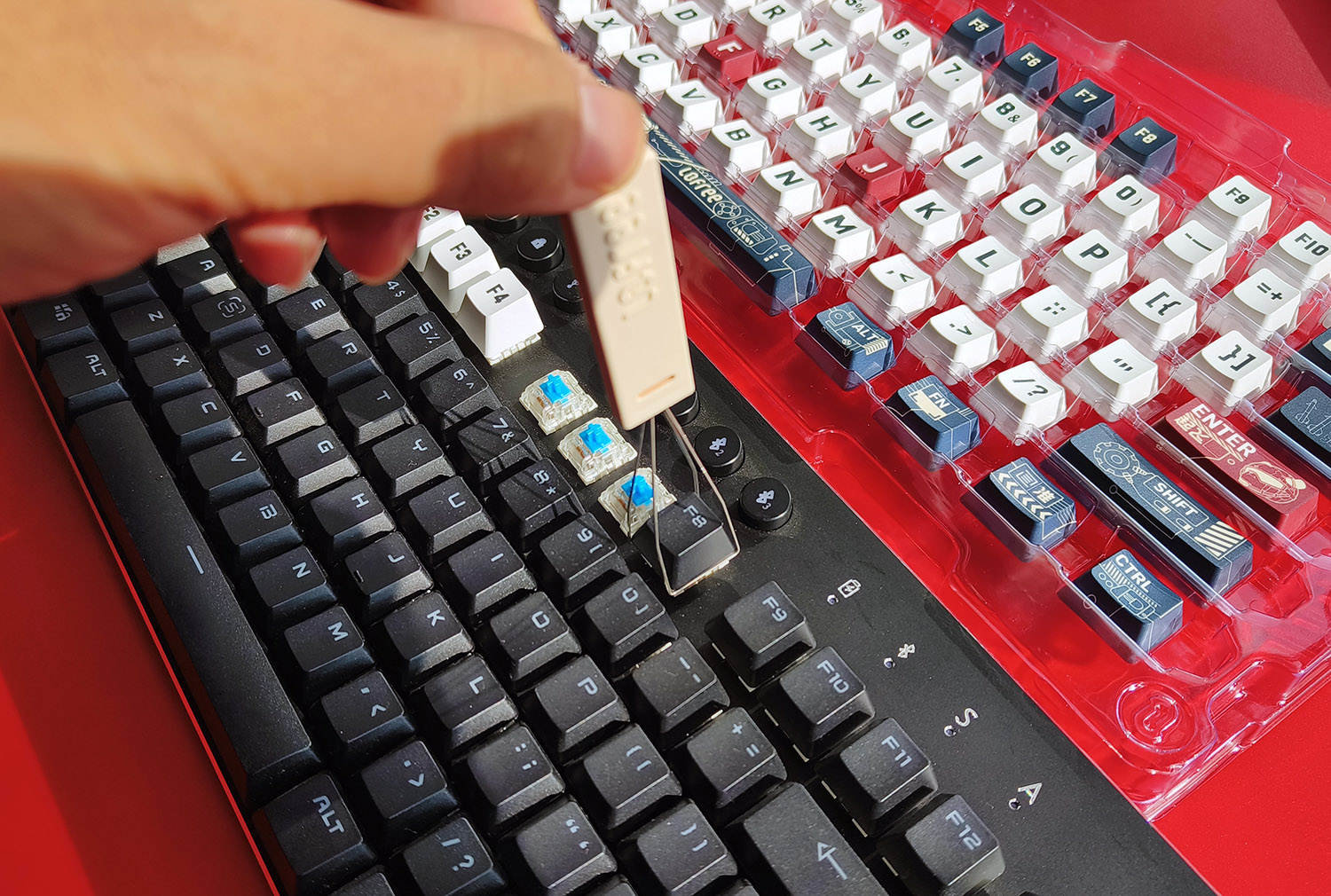随机附赠有一个键帽拔取器,可以轻松的拆下键帽进行更换,虽说更换这么多键帽也是个大工程,但是为了让键盘重获新生,这点耐心还是有的。