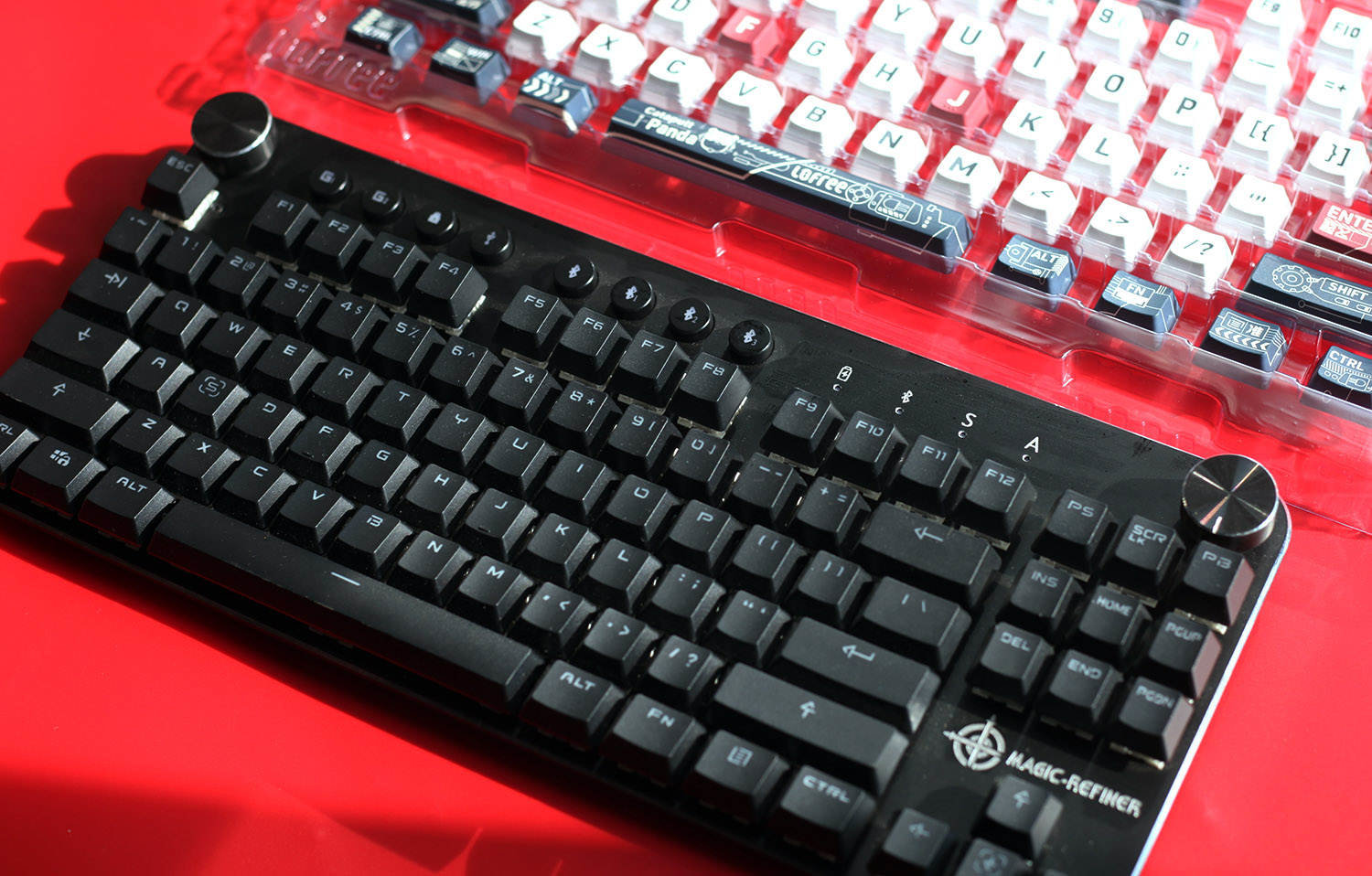 替换完键帽之后再来看,是不是和之前的键盘完全不一样了?黑色的盘底加上白色为主的键帽,再有红色作为点缀,简直帅炸了哇!而且Lofree洛斐键帽的字体非常大,看起来很清晰,辨识率很高,再也不用担心打错字了。