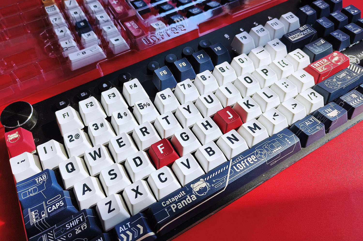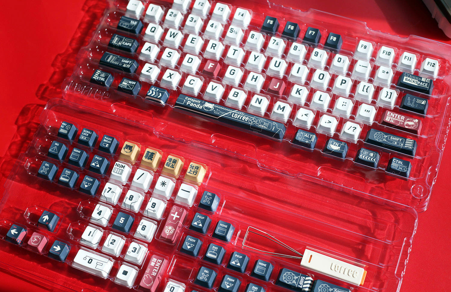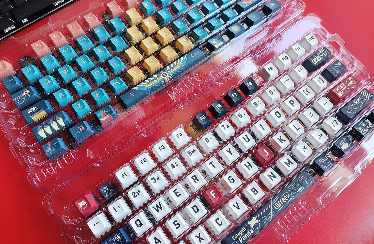 在键帽的选择上,我选择了外设品类中工业设计顶级的Lofree洛斐品牌,而且我一下子入手了两套键帽,分别是“舰载熊猫”和“法老”这两个主题,一套键帽是131键,足够应对各种键盘的需求了。