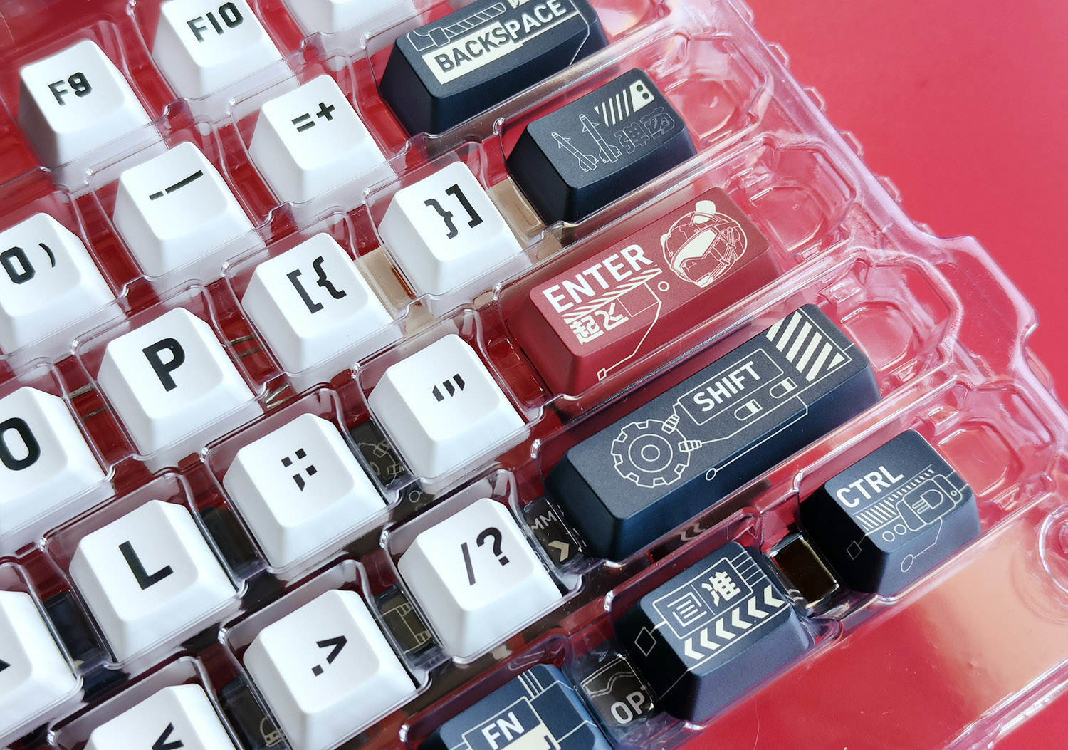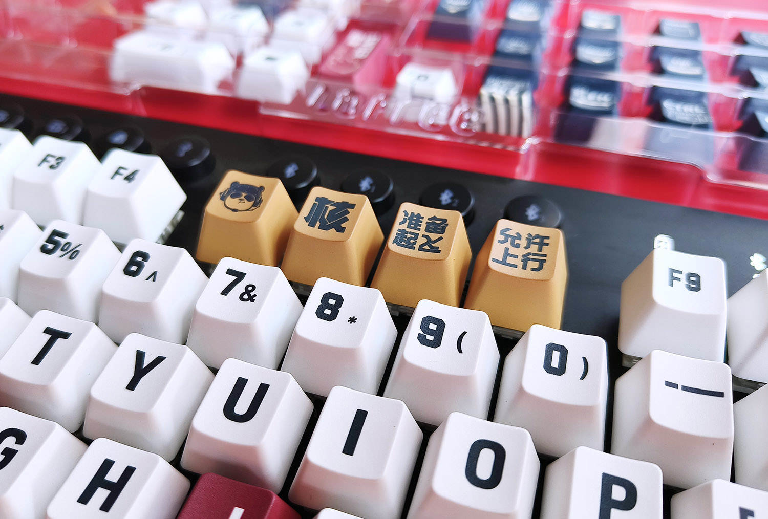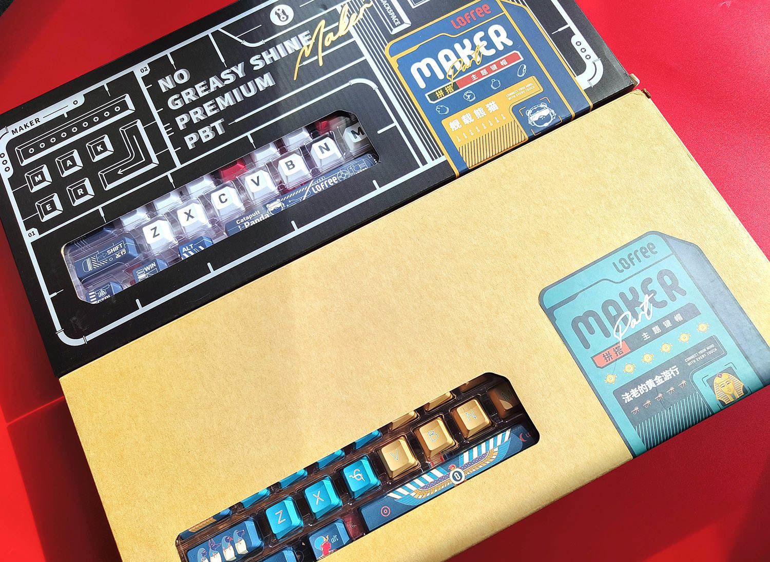 在键帽的选择上,我选择了外设品类中工业设计顶级的Lofree洛斐品牌,而且我一下子入手了两套键帽,分别是“舰载熊猫”和“法老”这两个主题,一套键帽是131键,足够应对各种键盘的需求了。