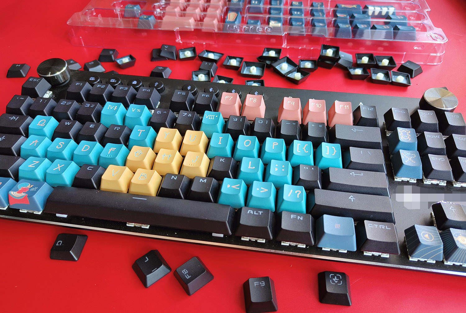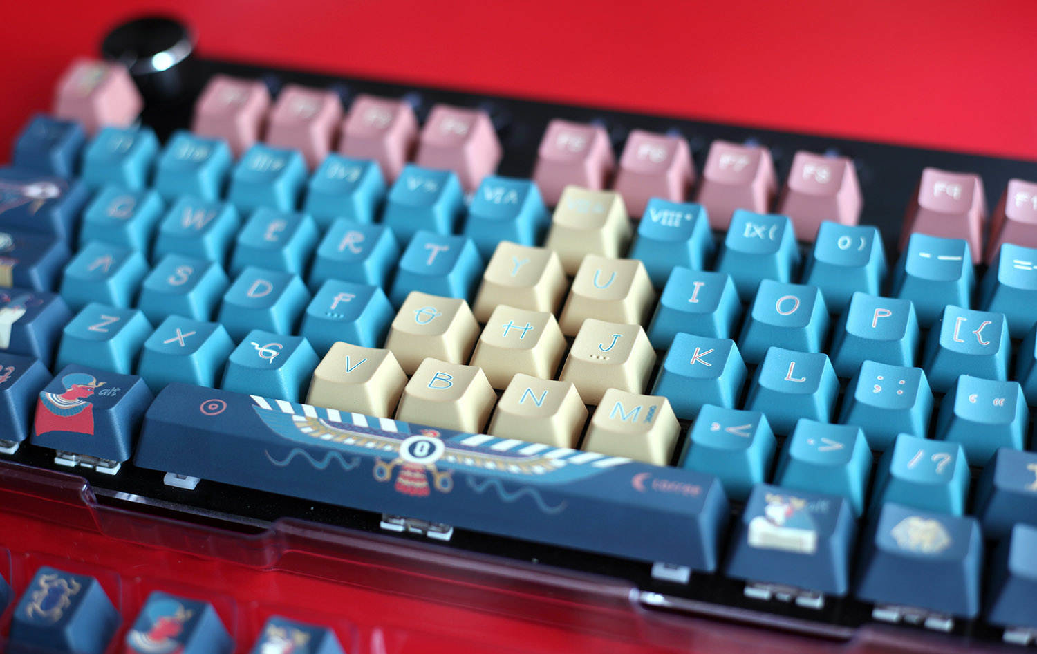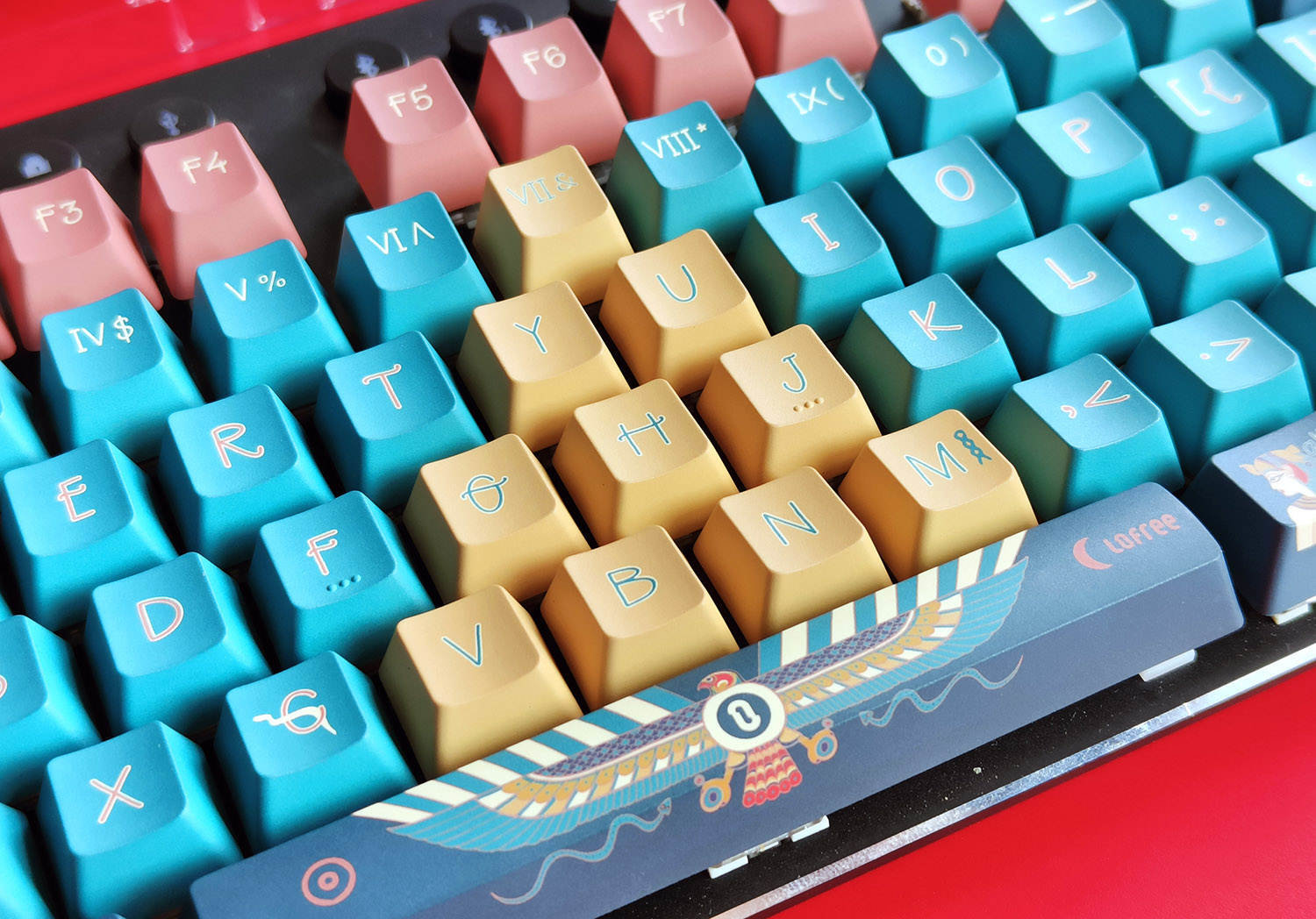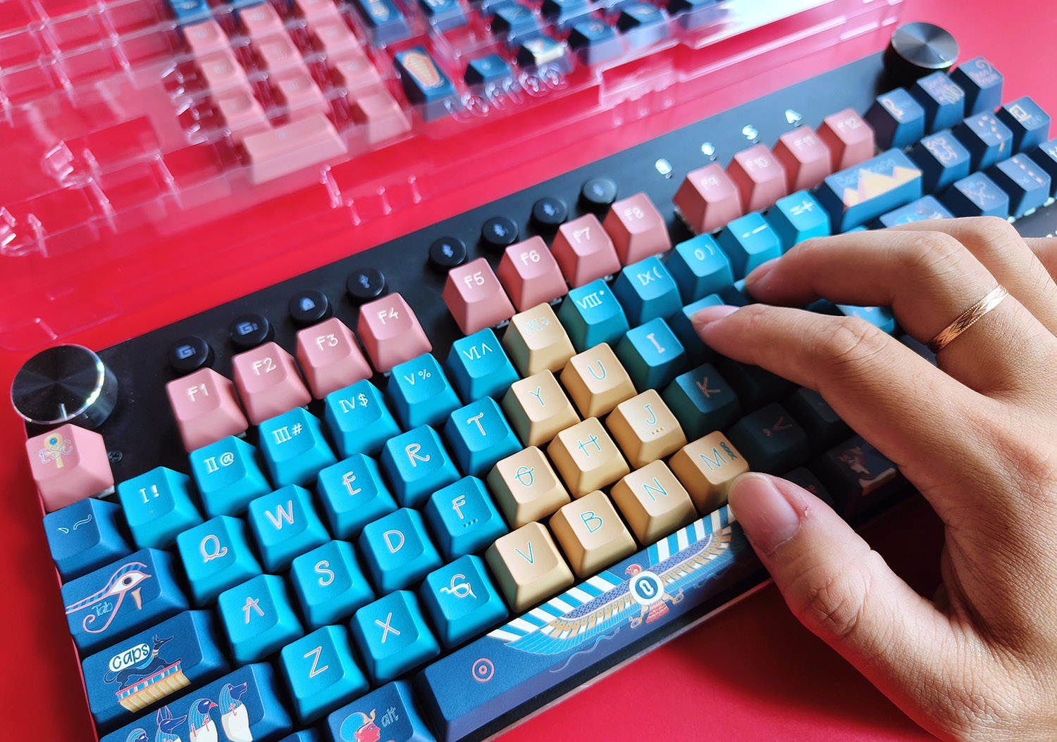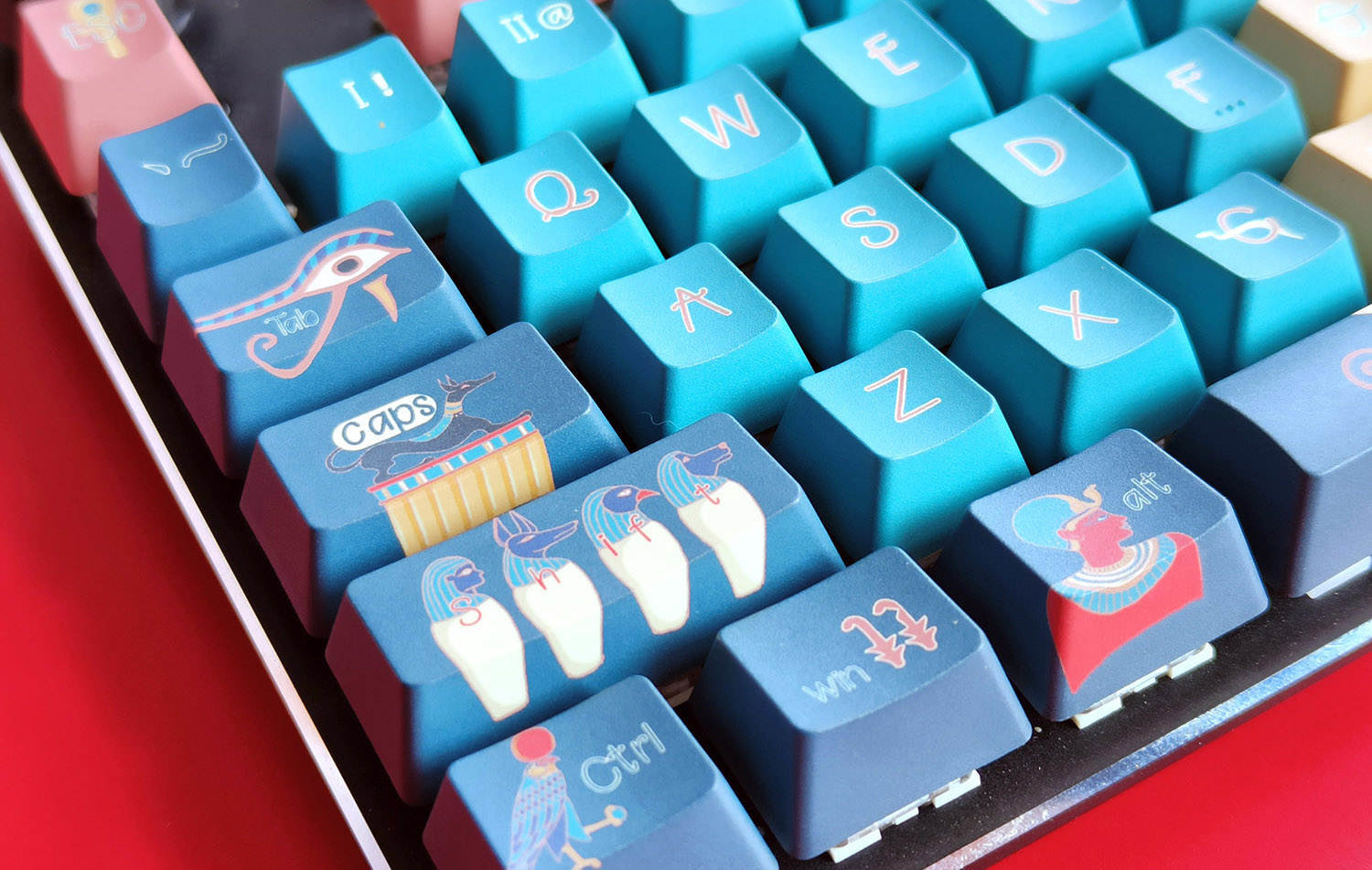 法老键帽是以粉色、黄色和蓝色为主的,不过这些颜色纯度都不高,而是一种粉嫩粉嫩的感觉,看起来十分柔和,整体视觉效果很舒适,哪怕是蓝色系也很适合女性使用。