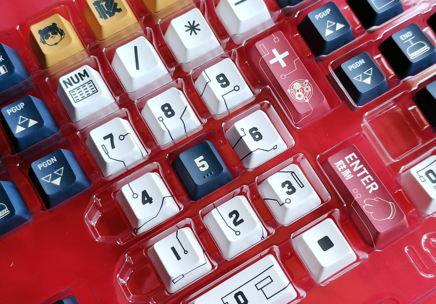 而小键盘则主要以红色为主,大一点的按键是完整图案,而小一点的按键则会把图案切割,看起来也很有艺术感。