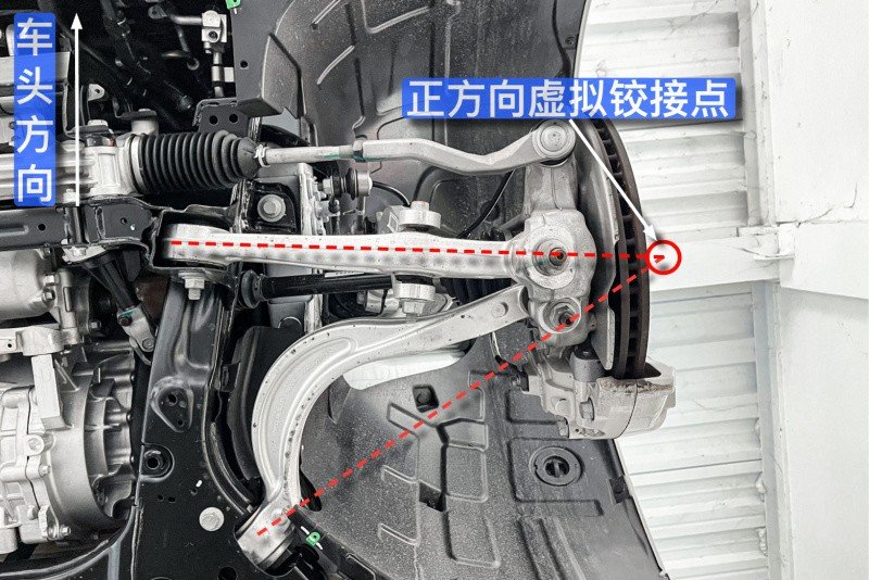 值得一提的是,极氪001下控制臂采用了一分为二的结构,将他们的连接点进行连线并延长后,可以看到他们的虚拟交汇点更贴近车轮,这样的设计相比传统的三角形控制臂而言,能够最大程度提供给车轮最理想的触地角度,提供更好的操控路感反馈和更稳定的高速行驶姿态。