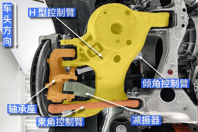 极氪001的后悬架采用了多连杆式独立悬架,由一根衬托弹簧的H型控制臂和两根连杆组合而成,均为铝合金材质组成。H型下控制臂采用一体铸造空心工艺与车轮架有两个连接点,同时弹簧座也集成在了一起,这样的设计优点在于相比只有一个铰接点的控制臂结构强度更高,还能衬托住极氪001超过2吨的车身质量。另外,H型控制臂与轴承座之间由一根垂直方向的连杆相接,它可以有效减小车轮和障碍物之间的撞击力度,从而提升车内乘客的舒适性。还能抑制轴承座受力产生的扭转,避免四轮定位参数改变而影响操控性能。