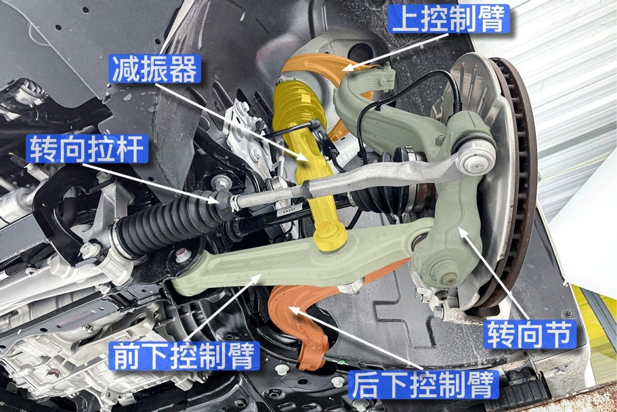 到了最为影响操控的悬架环节,极氪001采用了前双叉臂式独立悬架,悬架的所有部件还是全部用了铝合金材料,保证了整体的韧性和轻量化。整体前悬架由上叉形控制臂、下控制臂、减震支柱、防侧倾杆以及转向节等部件构成,由于上、下两个叉臂可以吸收横向力,搭配粗壮的前防侧倾杆保证了电车过重的质量在过弯时优秀的抗侧倾能力和抓地力。