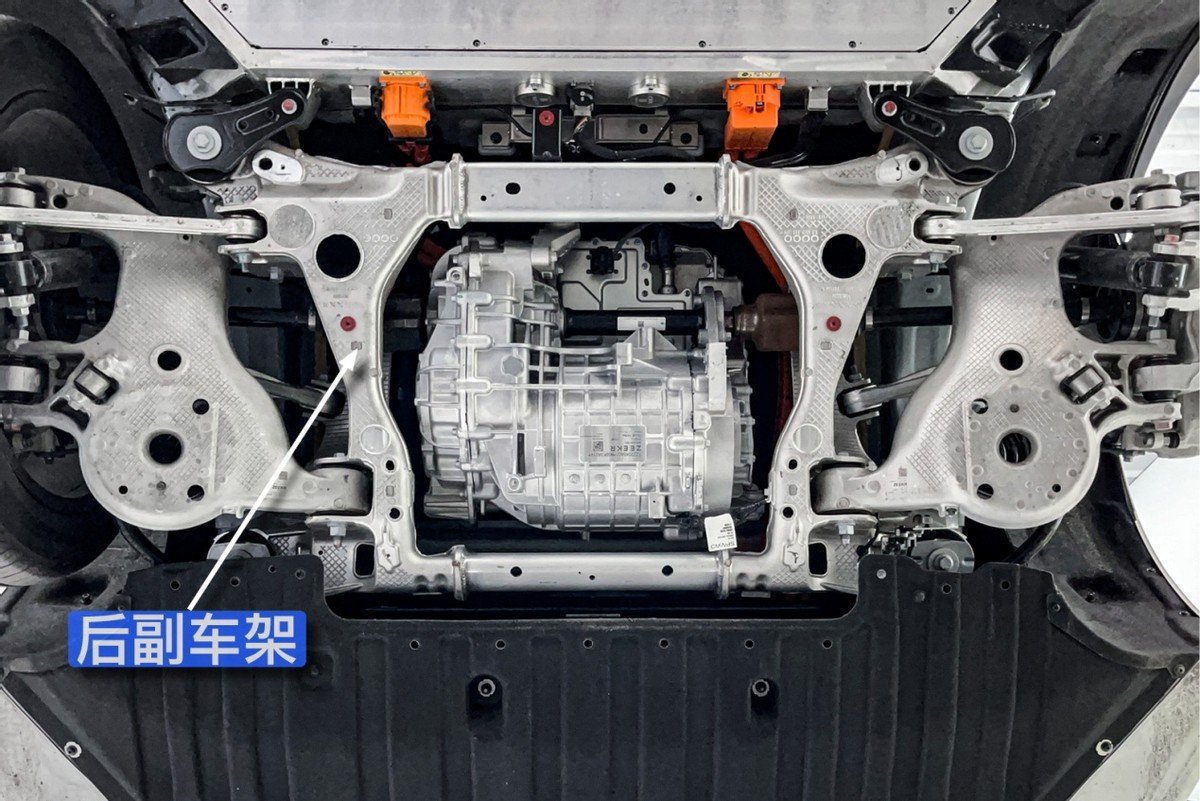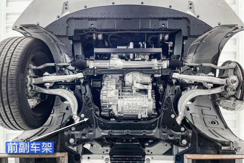 在浩瀚架构的加持下,极氪001的底盘十分平整,前车架采用了全框式结构,由钢制双片冲压焊接构成,由于全框式车架的封闭式特性,对动力总成与悬架系统提供了结构更完整的刚性支撑。在遇到正面碰撞事故时副车架与车身纵梁能共同吸收正面碰撞击力,并分散和导向冲撞力。