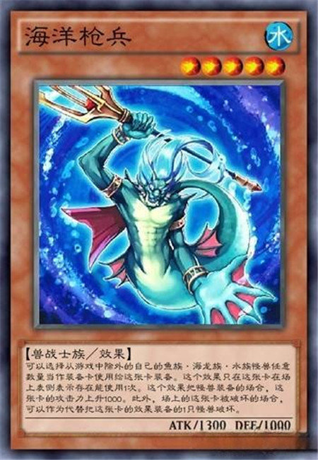 Sea Lancer。海洋枪兵是一张效果怪兽卡,持有将自己除外中的鱼族·海龙族·水族怪兽任意数量当作装备卡使用,以及在自身被破坏的场合将装备怪兽作为代替而破坏的效果。