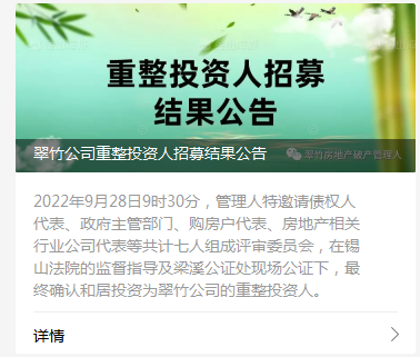 近日,翠竹房地产破产管理人公众号发布推文公示翠竹公司重整投资人招募结果。