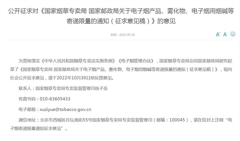 国家烟草专卖局此前明确指出,电子烟监管将参照传统卷烟有关规定执行。1993年2月国家烟草专卖局和原邮电部发布的《关于恢复烟草及其制品邮寄业务的通知》规定,邮寄卷烟、雪茄烟每件以二条(400支)为限(二者合寄时亦限二条)。邮寄烟叶、烟丝每件以五公斤为限(二者合寄不得超过十公斤)。2022年3月11日,国家烟草专卖局制定发布《电子烟管理办法》,其中规定,“寄递、异地携带电子烟产品、雾化物、电子烟用烟碱等实行限量管理,不得超过国务院有关主管部门规定的限量”。