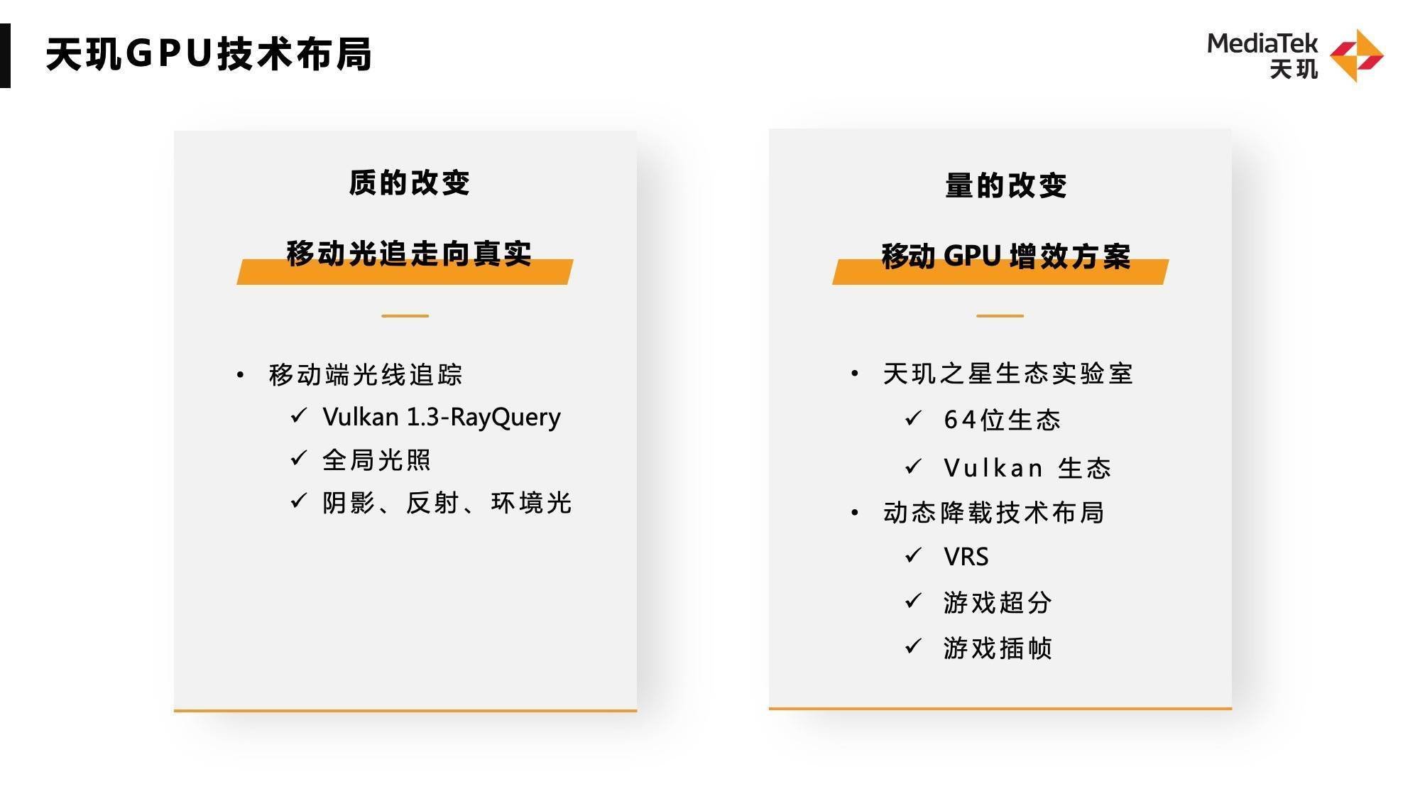 联发科还分享了移动GPU增效方案,这项技术能够针对GPU性能提升,搭配GPU周边技术,实现保持系统资源平衡的础上,满足高复杂度内容的计算需求。从性能和能效提升、生态发展、平台软件优化、自研算法等不同维度布局移动GPU增效技术。