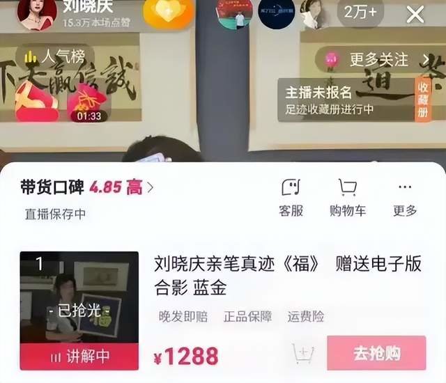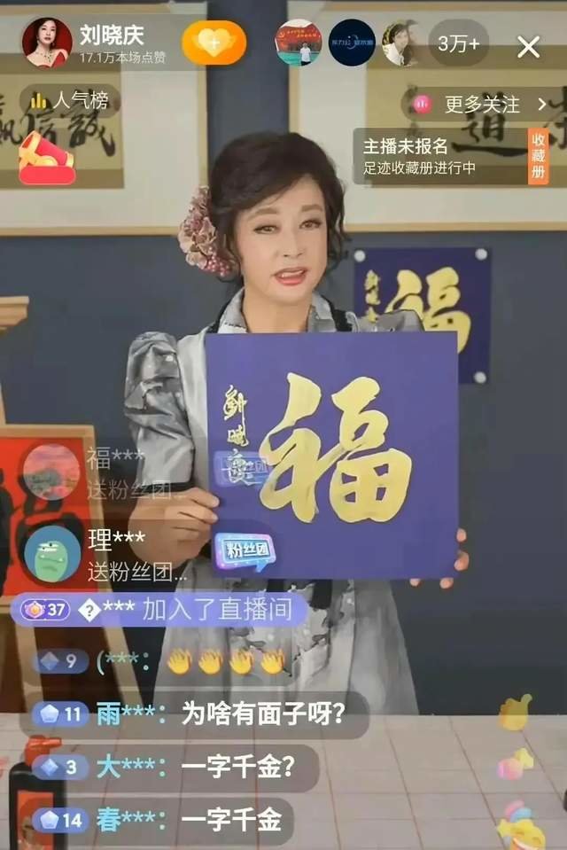 不过,可能是因为商品第一次上架,潜在的消费者们还没能做好心理准备,但这并不影响刘晓庆再接再厉。这不,她又一次在直播间里,当着几万人观看直播的情况下,挥毫写下了一个大大的“福”字,标价1288元,写字花了几秒钟,卖出去也花了几秒钟,这真是叫一字千金。