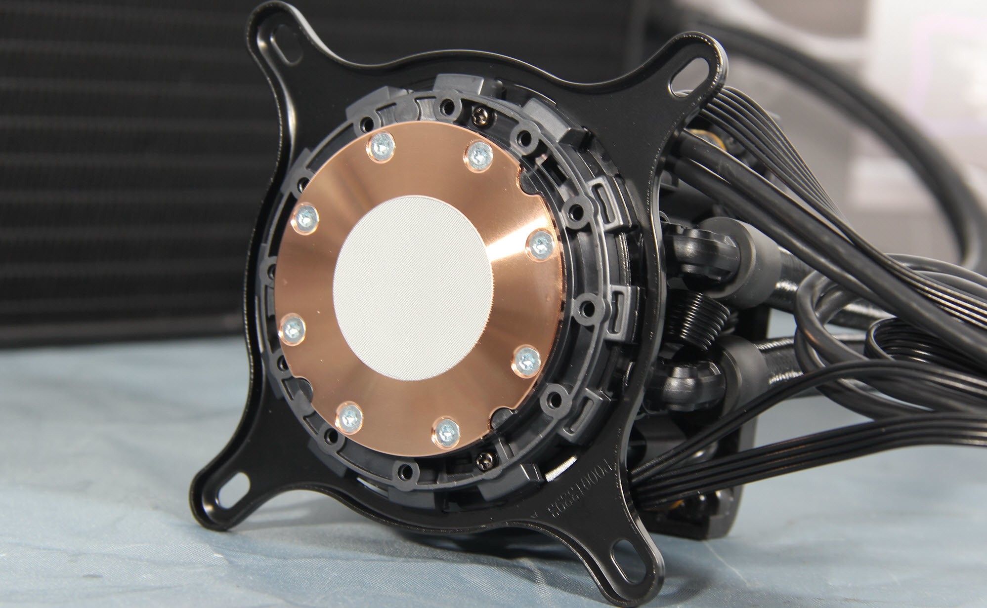 S360战神的核心便是这个Asetek7代的一体水冷头,微星跟Asetek深度合作开发的这款水冷头,首先是纯铜底打磨精细,预涂导热硅脂,默认装好了intel平台的扣具。