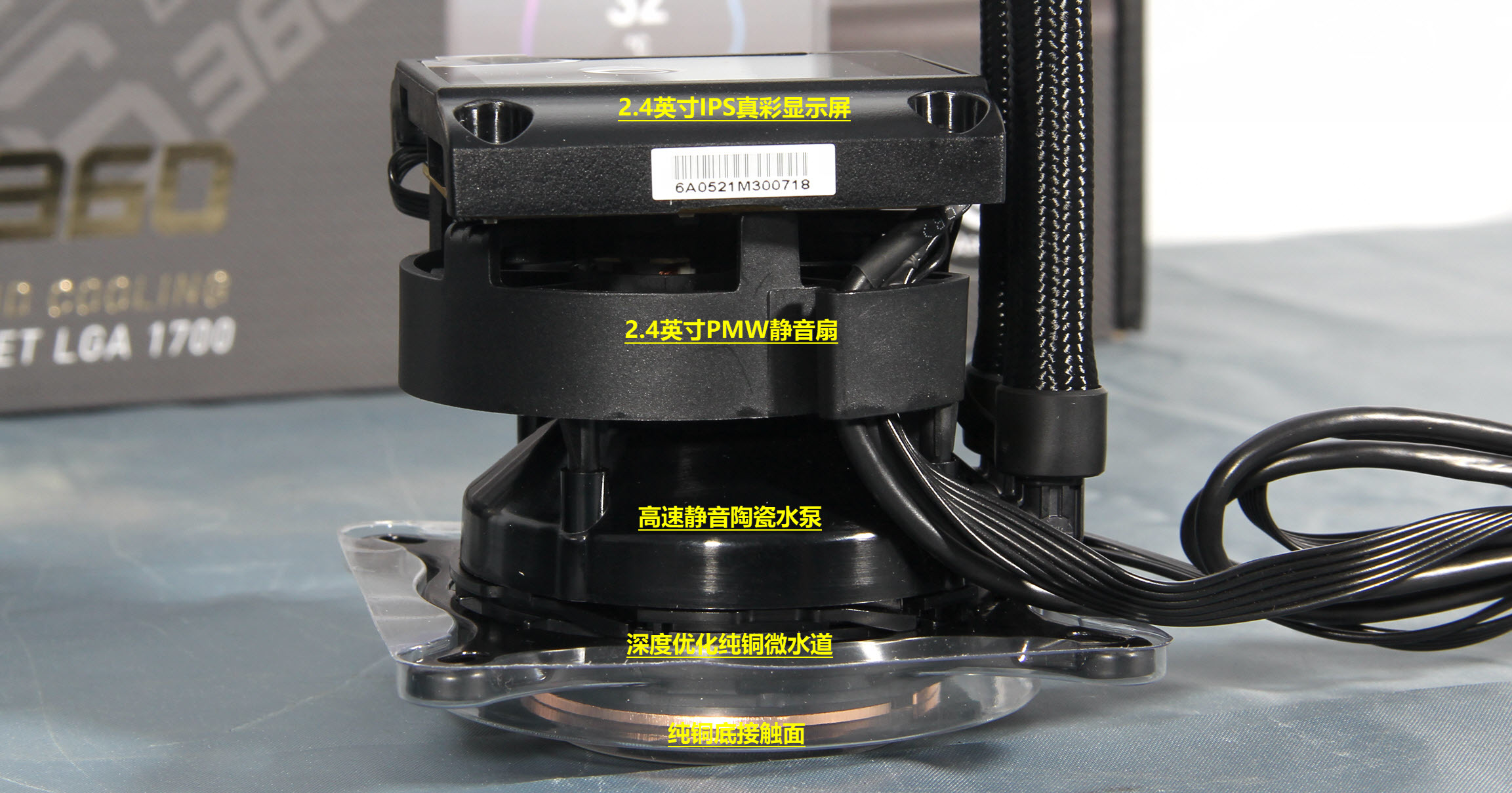 铜底之上是全金属外壳陶瓷轴承打造的高扬程水泵的一体式转动单元;再朝上是2.4寸的PMW小风扇,可以按工作温度的需要自动调整风扇转速,除了直接为水泵降温,还能辅助主板上CPU周边的供电模组降温;再向上则是2.4英寸IPS真彩显示屏。