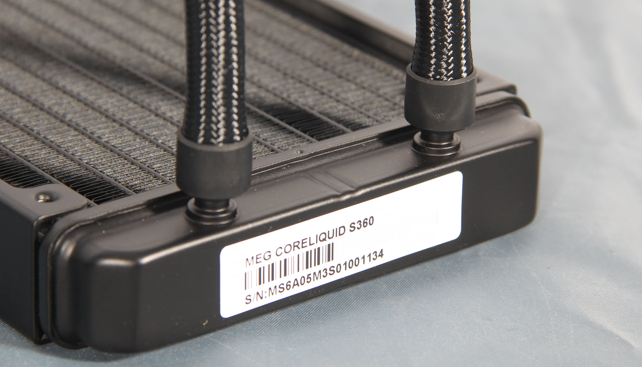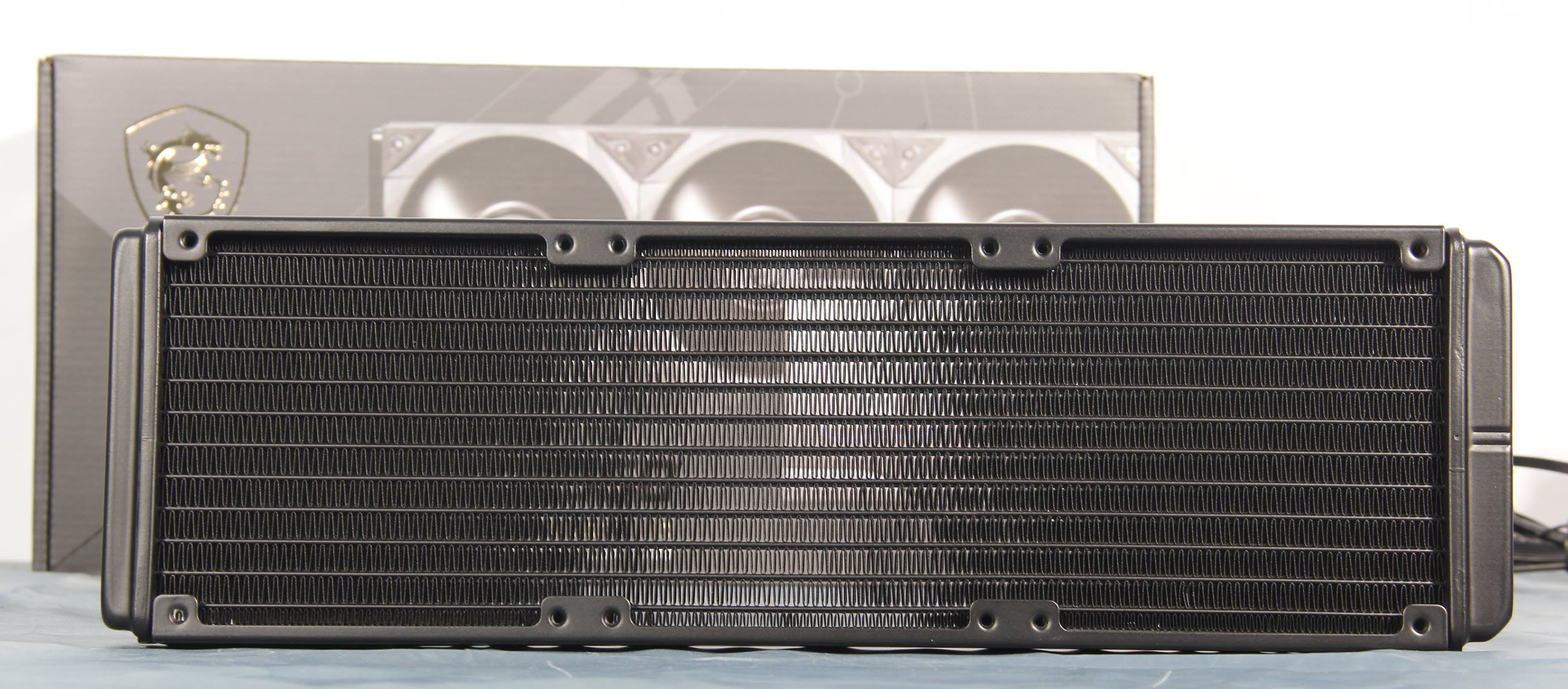 战神360的换热排为全黑化处理的铝材质鳍片,侧面有MEG的标识。冷排的厚度27mm。透光可以看到鳍片没有任何变形,但是日后安装时还是要小心,铝制鳍片偏软,很容易受伤,所以建议装好就别拆,即便是风扇清灰,把风扇拆下后用毛刷和吹风机清一下冷排就好了。