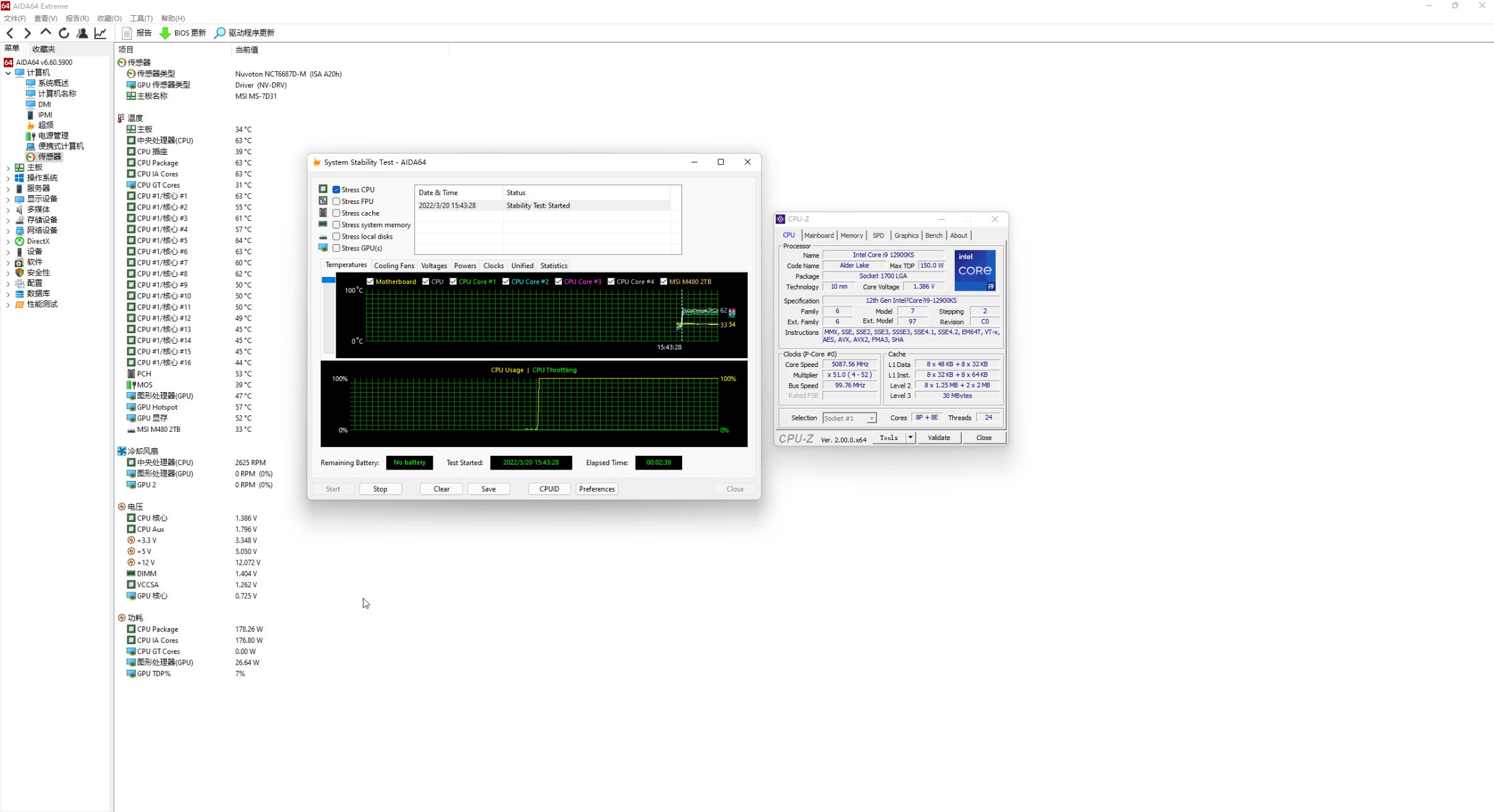 最令人兴奋的就是使用战神对12900KS的拷机直接进行实测。极限TDP据说在241W左右,相当恐怖的存在,实际上我并没有做到全面烤机,也就是说我实在不敢说i9-12900KS是个什么恐怖的存在!所以aida64我只测试了CPU拷机,并没有拉FPU!