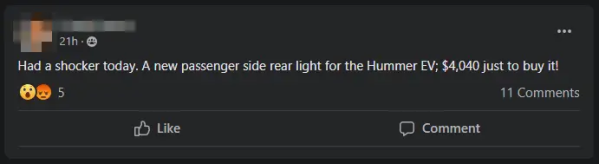 IT之家 10 月 15 日消息,通用电动悍马的车主必须要非常小心,不要损坏他们车辆的尾灯,因为更换尾灯的费用极其昂贵。最近,一位车主在网上吐槽,更换副驾一侧的尾灯时被报价 4040 美元(约 29088 元人民币),这还不包括工时费。
