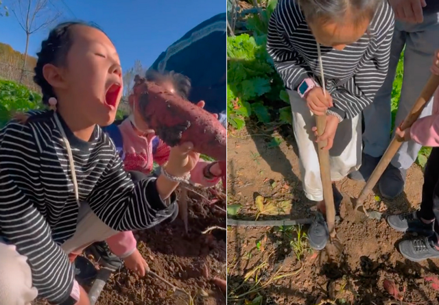 杨思宜在挖到一颗大地瓜的时候,兴奋得对着镜头展示她的劳动成果,还假装要吃到肚子里,言行举止可爱十足。后续杨思宜直接换成稍微大一点的铁铲开始挖,姿势看上去特别熟练,挖到最后收获满满。不得不说,杨帆夫妇将女儿的动手能力培养得相当不错。