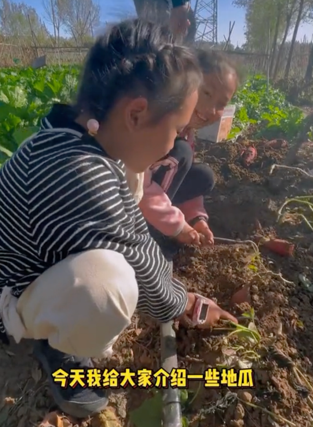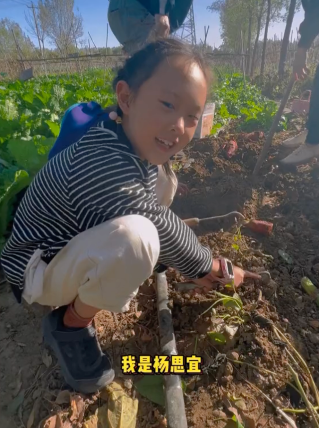 视频中只见女儿杨思宜打扮朴实简单,扎着两个麻花辫看上去十分呆萌,手中拿着小铁铲不怕脏的正在土地里挖着地瓜,嘴里还不停的给网友们进行介绍。