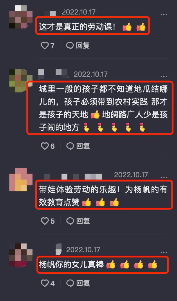 网友们也毫不吝啬的在评论区夸赞道“杨帆你女儿真棒,带娃体验劳动的乐趣,为杨帆的有效教育点赞。”不难看出,网友们在杨帆夫妇对孩子的教育方面十分认同。