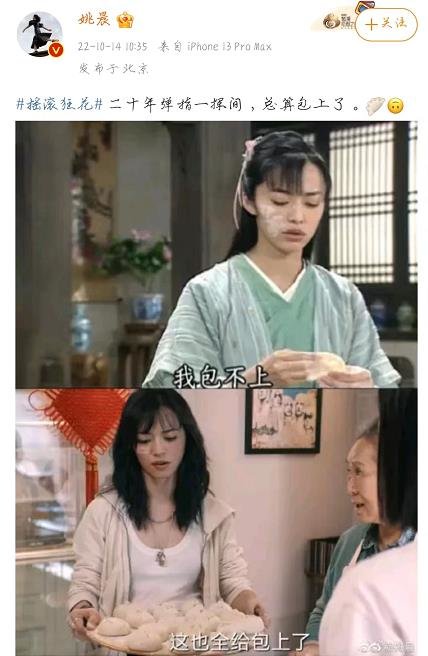 近日,姚晨在个人平台上晒出一张拼图,拼图的上半张是姚晨在出演《武林外传》时,饰演的郭芙蓉包饺子却没包上的场景。而图片下半部分是姚晨在新剧《摇滚狂花》中饰演的彭莱端着包好的饺子出来的一幕。姚晨还配文:“二十年弹指一挥间,总算包上了”。