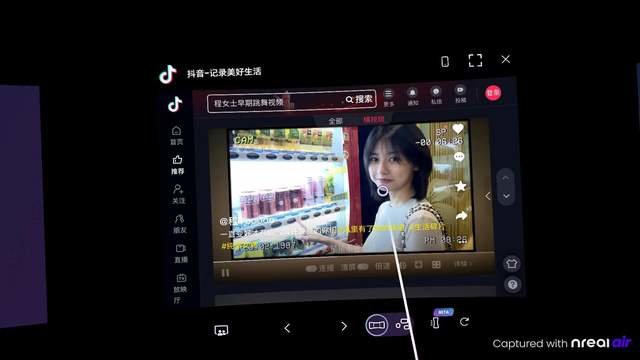 连接手机之后,在Nreal App首页提供了AR模式和空中投屏模式两种玩法。一种是空中投屏,简单来说就是手机投屏功能,它可以直接把手机画面投屏到眼前的虚拟屏幕上,直接将小屏幕变成直接变成最大130英寸的超大屏幕,这个屏幕下看抖音、快手那感觉太酷了。