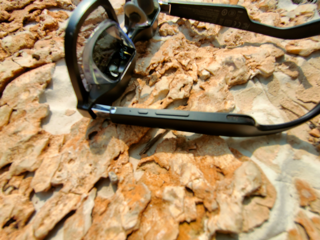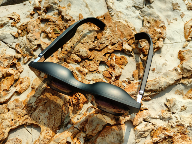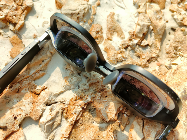 这款AR眼镜特别之处在于将迷你OLED屏幕放在了镜框上方部分,上面有2块1080p的索尼Micro OLED屏幕,镜片后方则是BirdBath成像的透镜部分,屏幕显示内容两块屏幕显示的内容折射到我们的眼睛里,而不像其他智能眼镜镜头放在镜腿旁边,更显低调。