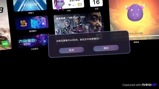 还有一种模式就是AR空间模式,就是3D虚拟大屏,很像家里的智能电视,用眼镜就可以享受最大201英寸巨幕的3D全景空间视野,荧幕窗口大小、远近以及位置都能调整。手机就成了虚拟遥控器了,虚拟射线进行选择,拖拽、返回、确定等遥控器、鼠标才能完成的操作。