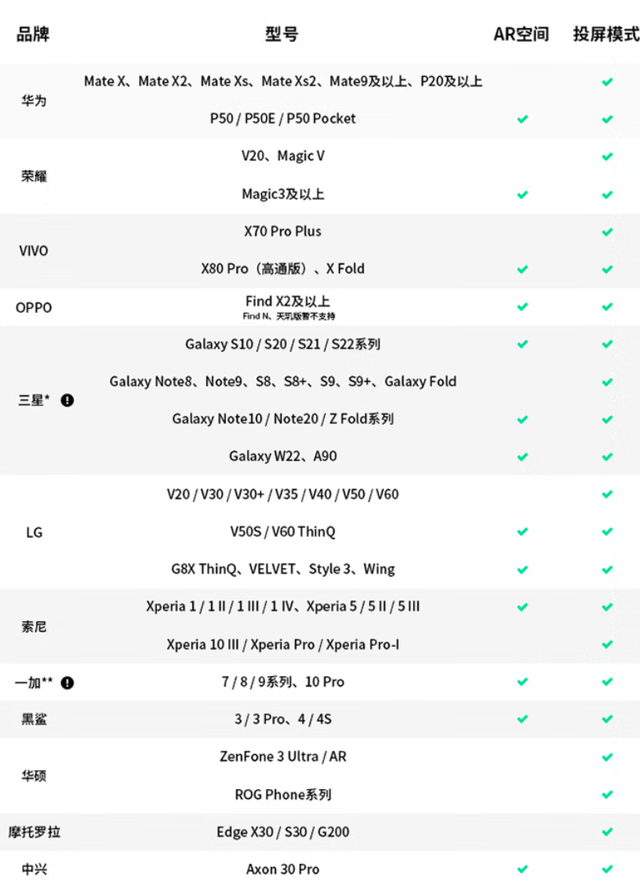 Nreal Air没有内置处理器,因此所有的处理都是要依靠手机来完成。一定要注意的是,这款眼镜适配的手机型号还不太多,目前只支持最新的苹果、三星华为、小米、OV等品牌少数几款旗舰手机,这个是购买前一定要注意的。