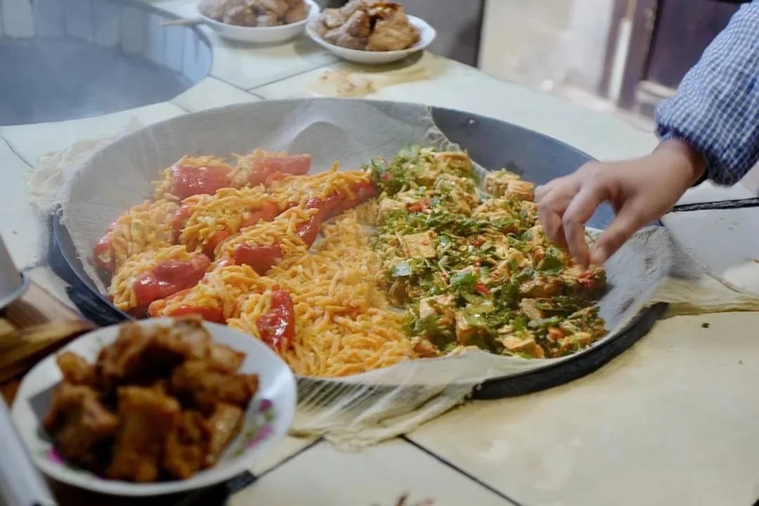 汪娜小的时候吃过那么多炊粉,最念念不忘是炊粉豆腐。“豆腐的话其实很讲究,炊豆腐的时候呢,必须自己家做的,有的人喜欢放点芹菜叶子,有的人是会放点韭菜,豆芽是必须要放,再放点自己家腌制那个腊肉。腊肉切碎下锅,炊不能超过八分钟,超过八分钟出来之后,首先颜色就不好看,它会变黄,因为是带绿色的叶子嘛。再是那个豆腐就会老掉,里面会出孔,这个豆腐就感觉很老。七到八分钟出锅的话,那个豆腐出来就很嫩,也是特别香、入味。对,炊粉主要是时间上那个火候一定要控制好,你一旦时间过头,或者是那个时间没到,那个米粉就容易炊不熟。但是你炊过头呢,颜色、质感都会变。”