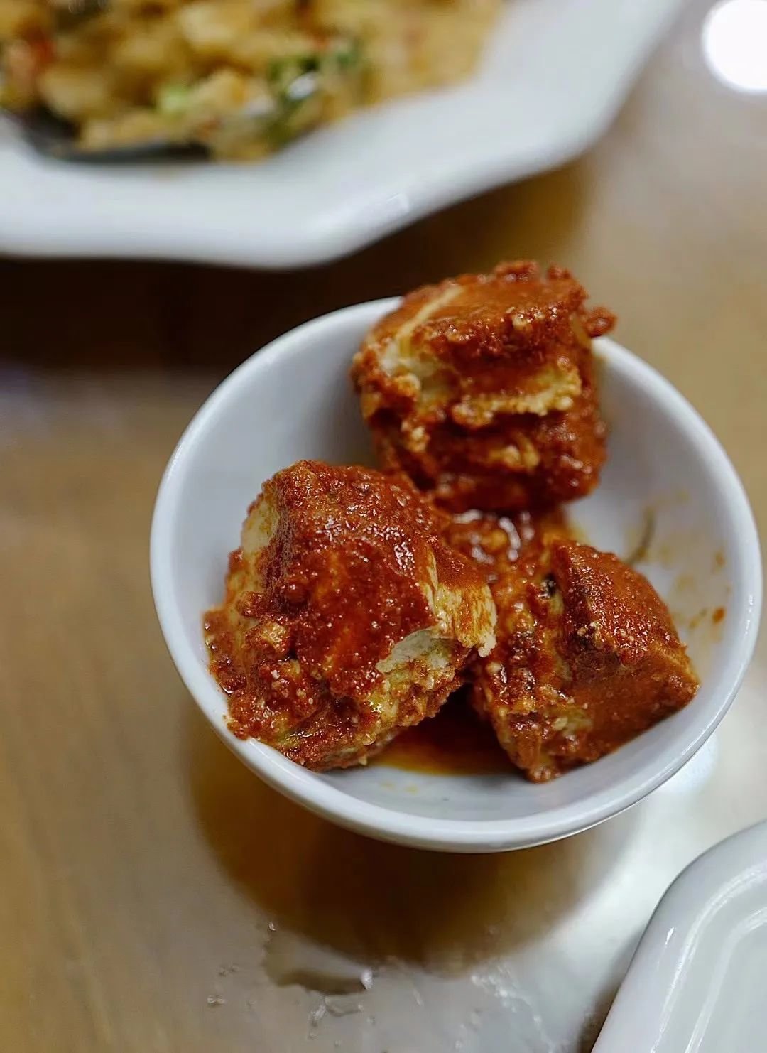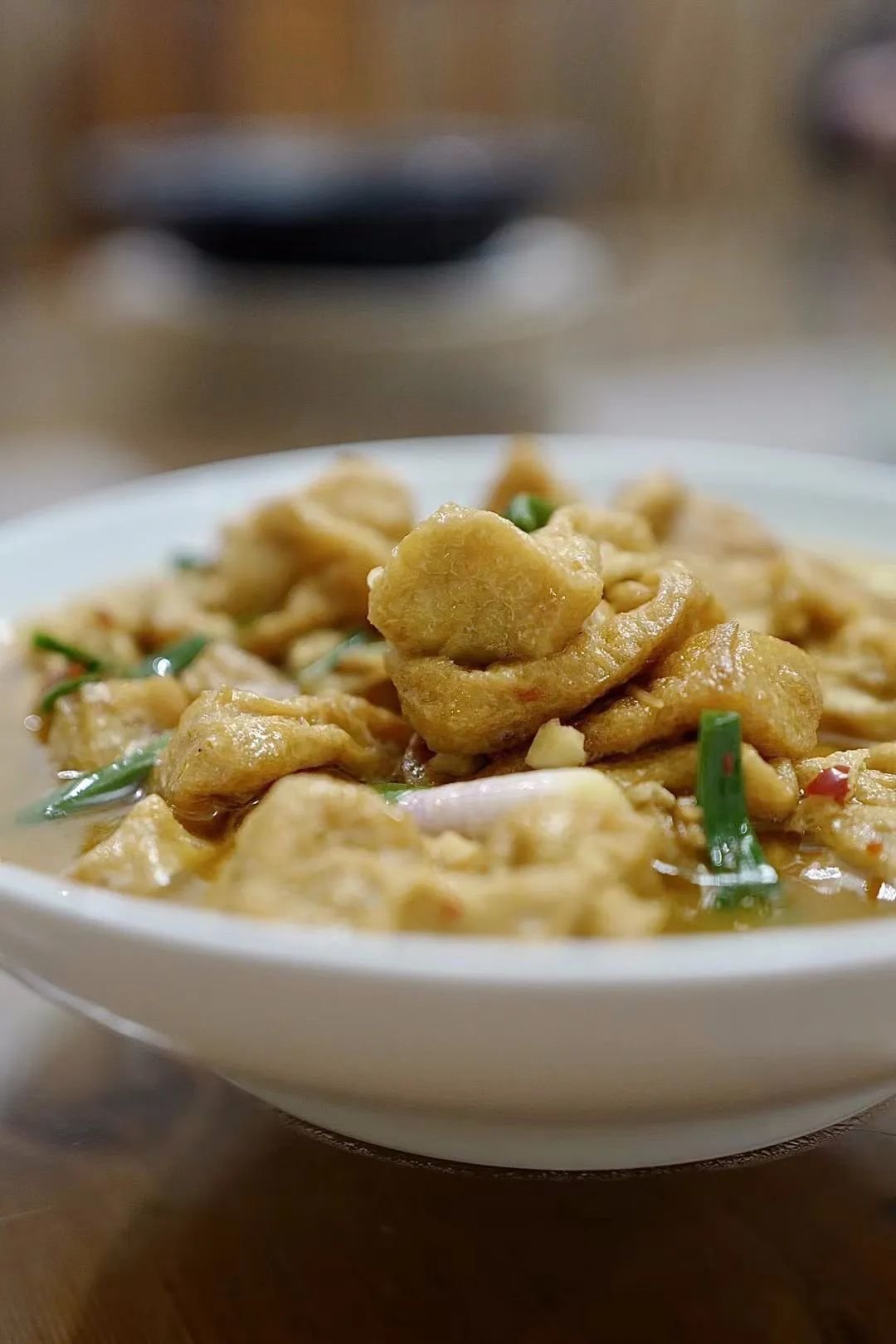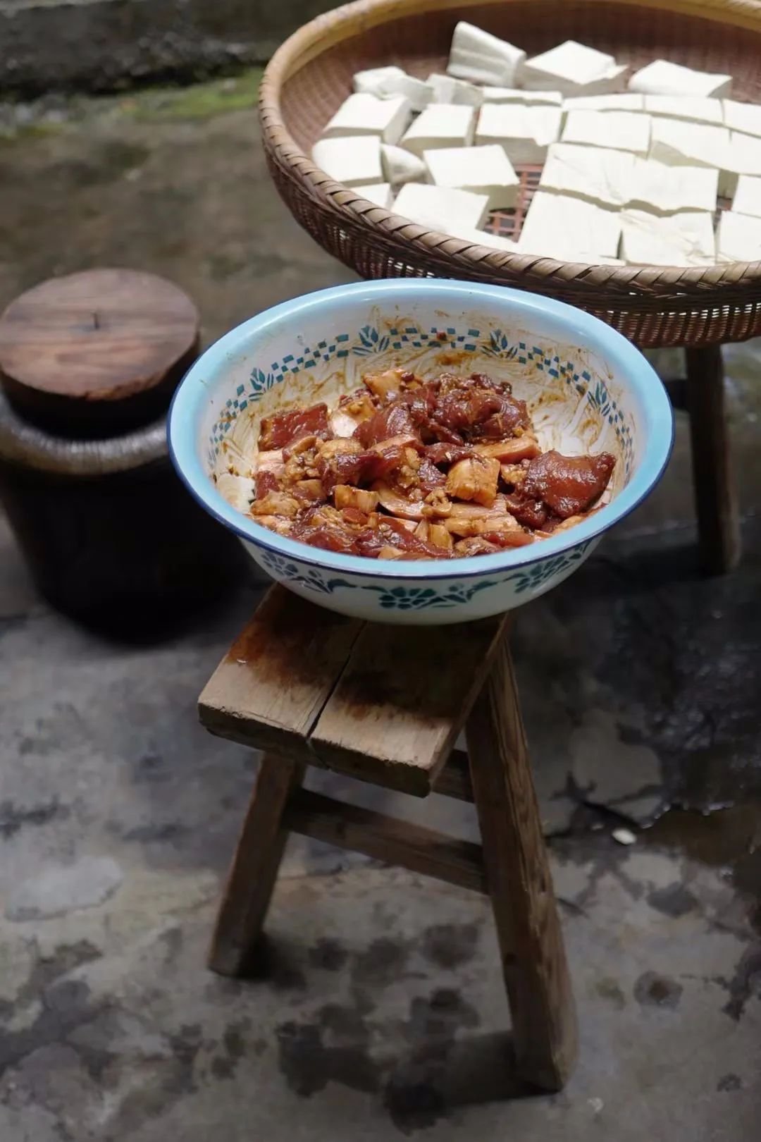 一旦家里三十前做豆腐,考虑满足苏庄人家里不同偏好,就有了豆浆、豆腐脑、嫩豆腐、老豆腐、油豆腐,各色质感,列队排开,但无一例外的,足量好吃。这里过年的炊粉豆腐就应运而生,按苏庄传统是用老的,新派的也有用嫩的。豆腐都是按脸盆计,一餐要吃到正月初八。“就像那个炊豆腐,我公公他喜欢吃整块豆腐,我喜欢吃馅,就是调配料,豆芽之类。”新茶油泡的大颗油豆腐,中间嵌入馅料后,也可以炊。开化过年泡油豆腐已经成为餐桌必不可少“年货”,妈妈一泡就是几个脸盆,一家人可以吃到正月十五以后。