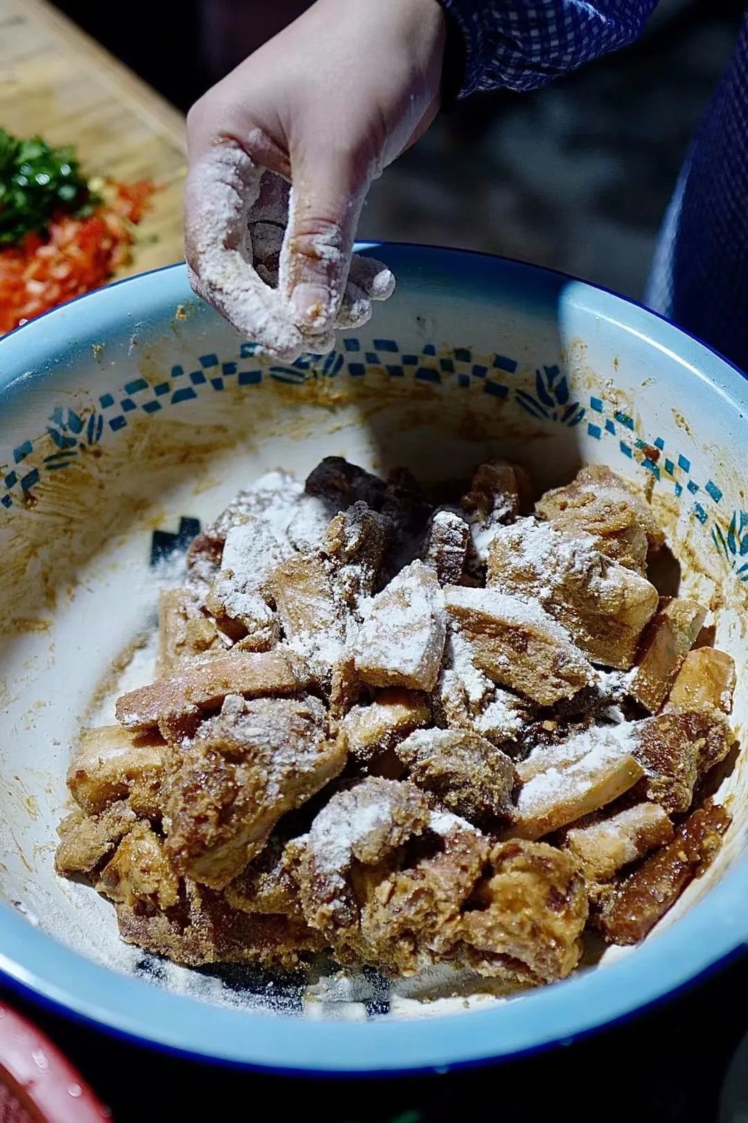 回想炊粉的历史,起初是因为穷,山区缺粮食,所以过年,这里的人们把米碾碎了炒一炒,包在食物上蒸了宴客。我现在吧嗒着嘴巴听这话,觉得非常凡尔赛。至于粉蒸肉的起源,随众说纷纭去吧,我先吃为敬。