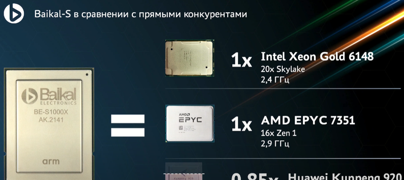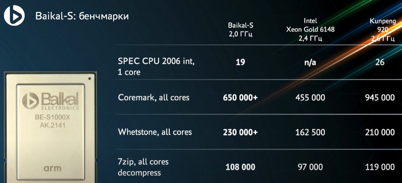 根据10月14日推特上曝光的贝加尔电子的S1000系列处理器的规格资料显示,将S1000与20核Intel Xeon Gold 6148、16核AMD Epyc 7351和48核华为鲲鹏920进行了比较,S1000性能大约与AMD和英特尔CPU相当,同时也达到了7nm制程的华为鲲鹏920的SoC的85%。
