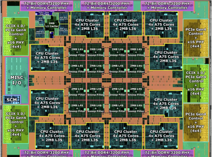 SoC的外围是 I/O 控制器。左右两侧容纳了五个 PCIe 4.0 x16 控制器,其中三个可以兼作 CCIX 1.0 模块,并启用 2 路和 4 路 SMP(对称多处理)。顶部和底部是六个内存控制器,每个控制器都可以处理一个 72 位通道,到 128GB - 768GB的带ECC的DDR4-3200。